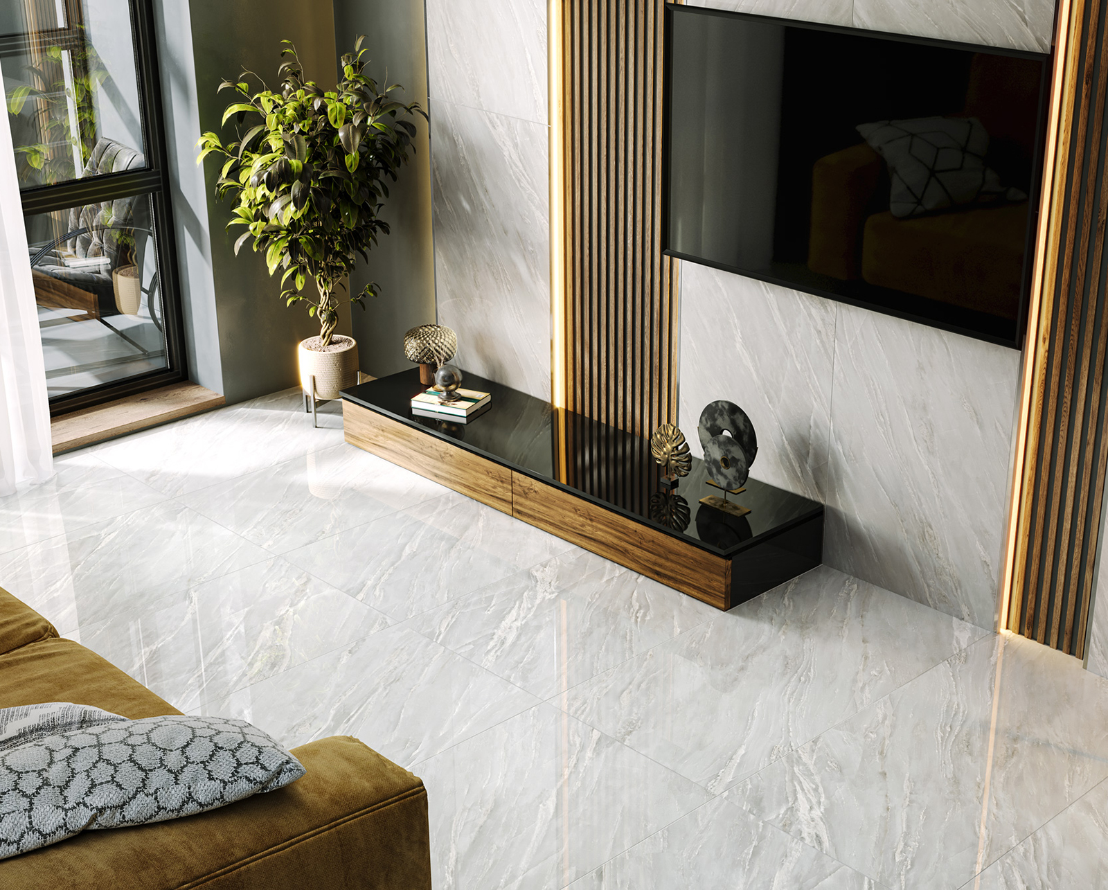 Полированная коллекция Tamarino в формате 600х1200 мм произведена с использованием текстуры итальянского кварцита Tamarino, добытого в горах Тосканы. Его уникальный глубокий дымчато-серый оттенок с деликатными прожилками в виде разломов, которые заполнены кристаллической белой породой, завораживают своей уникальностью. Tamarino совместил в себе эстетику текстуры и долговечность материала. Ведь не зря керамогранит ценится на протяжении многих лет за свою необычайную долговечность, прочность, эстетику и функциональность.