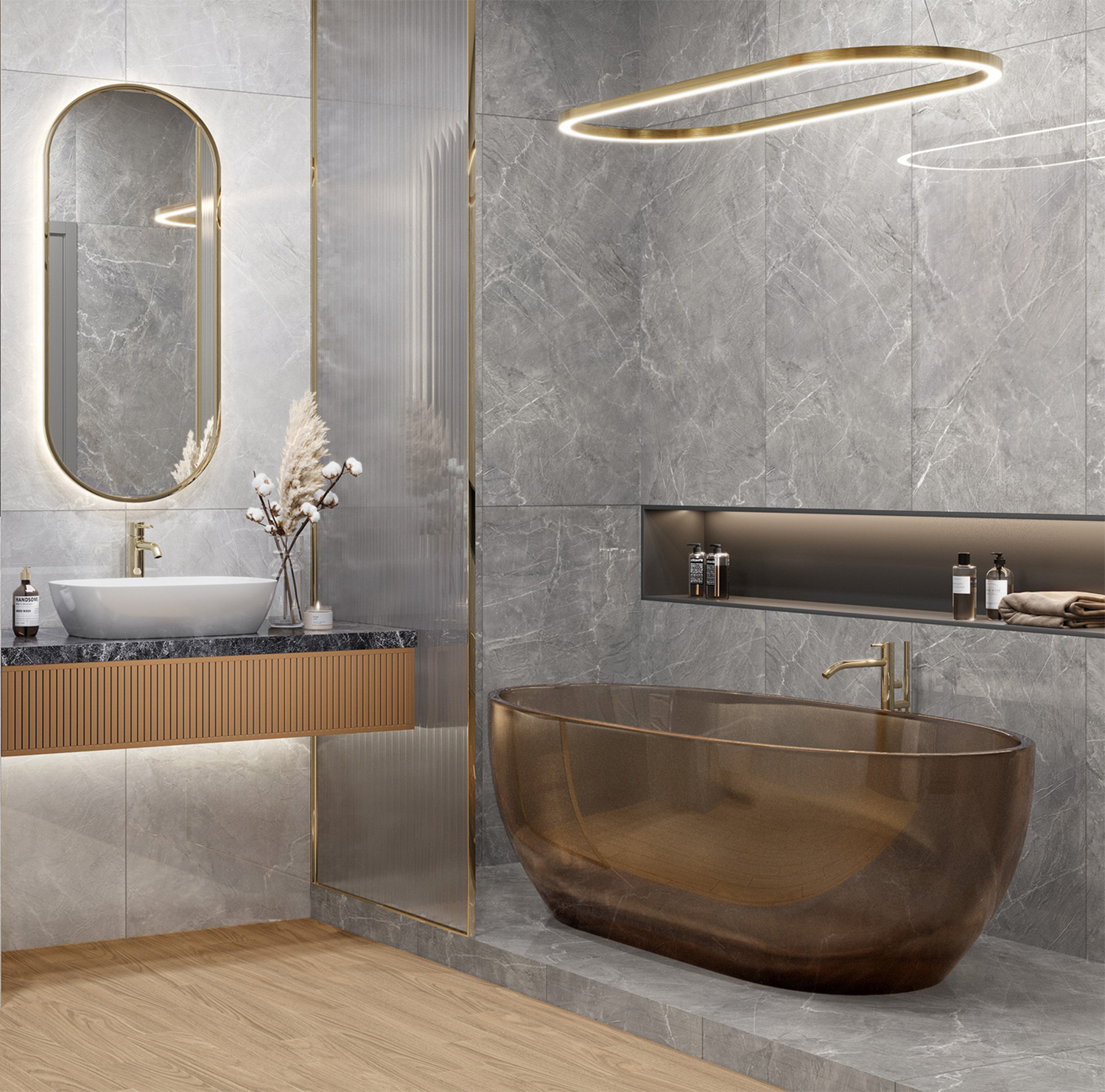 В соответствии с развитием керамической моды и стиля дизайнеры бренда NewТrend разработали коллекцию полированного керамогранита Terra в формате 600х1200 мм. Реалистичные оттенки и узор натурального камня дополнительно усиливает полированная поверхность. Коллекция представлена в трех цветах: темный вулканический графит, гранитный серый и песчаный бежевый оттенок. Края керамогранита ректифицированные, что позволяет осуществить укладку с минимальным швом.