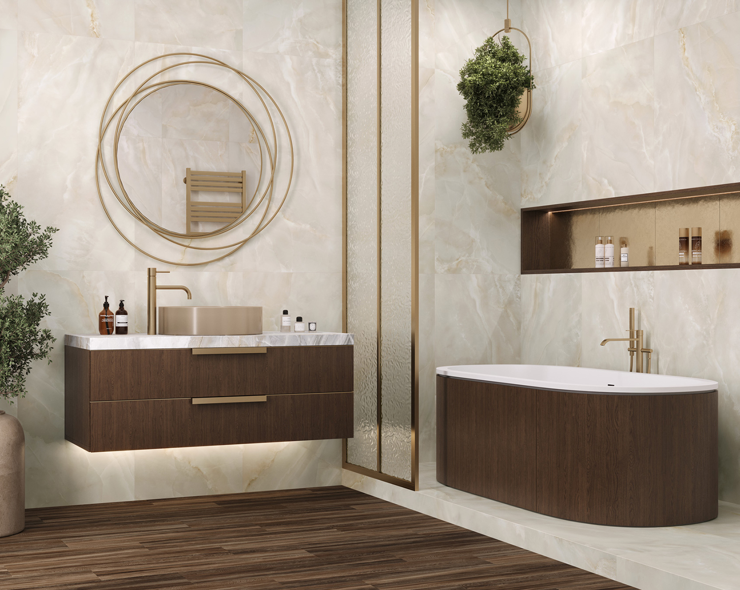 Оникс — это уникальный природный камень с полупрозрачной структурой и сложными узорами. Природные волнообразные градиенты словно наслаиваются друг на друга, образуя уникальный рисунок. Дизайнеры бренда используют эксклюзивные текстуры, бережно перенося их на поверхность керамогранита. Его можно использовать для отделки всего пространства или как компаньон в качестве интересного акцента, сочетая его с белым мрамором, бетонной или деревянной текстурой. Такие варианты сочетаний смотрятся свежо и современно. В коллекции три оригинальных цвета с поверхностью sugar.