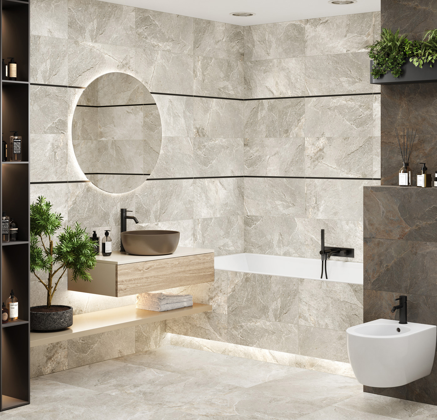 Самая долгожданная новинка этого года, которая является новым и актуальным трендом керамической моды — это коллекция Stoncrete. Графика кварцита исполнена на рельефной фактуре камня в оригинальной поверхности матовой полировки. За счет того, что объемная рельефная поверхность полируется только сверху по высотам рельефа, получается эффект матового основания с глянцевой каменной фактурой. Такой дизайн будет эффектно смотреться как в санузле, так и в гостиной зоне TV с дополнительной подсветкой. Эффект лаппатирования присутствует в формате 600x1200 мм, форматы 600x600 мм и 300x600 мм выполнены в матовой поверхности.