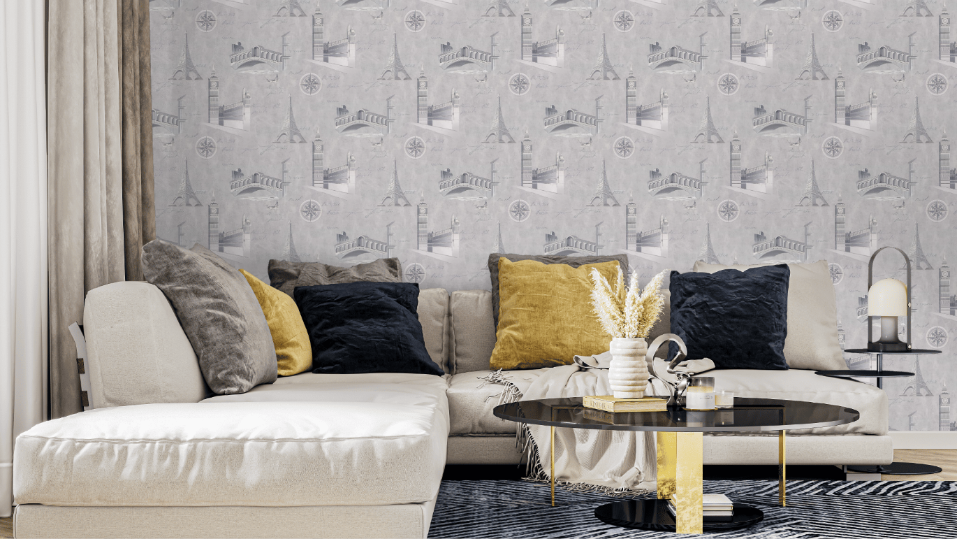 Зеркальные силуэты европейских городов навевают мечты о романтике Венеции, Лондона и Парижа. Графичный мотив воплощает художественные элементы гравюры, а текстуры аккуратно прочерчены разнонаправленным штрихом. Матовая текстура фона объединяет воедино рисунок и компаньон, акцентируя внимание на блестящих архитектурных шедеврах Европы. Шероховатая на ощупь фактура притягательно имитирует необработанную стену, воплощая в интерьере тенденции гламурного лофта. Приятным акцентом станут металлизированные надписи, выведенные ровным каллиграфическим почерком. Коллекция окрашена в нейтральные спокойные цвета – оттенок серого жемчуга, пепельный, ореховый, каштановый и глубокий графитовый. Они помогут создать контраст или подчеркнуть общий стиль оформления.