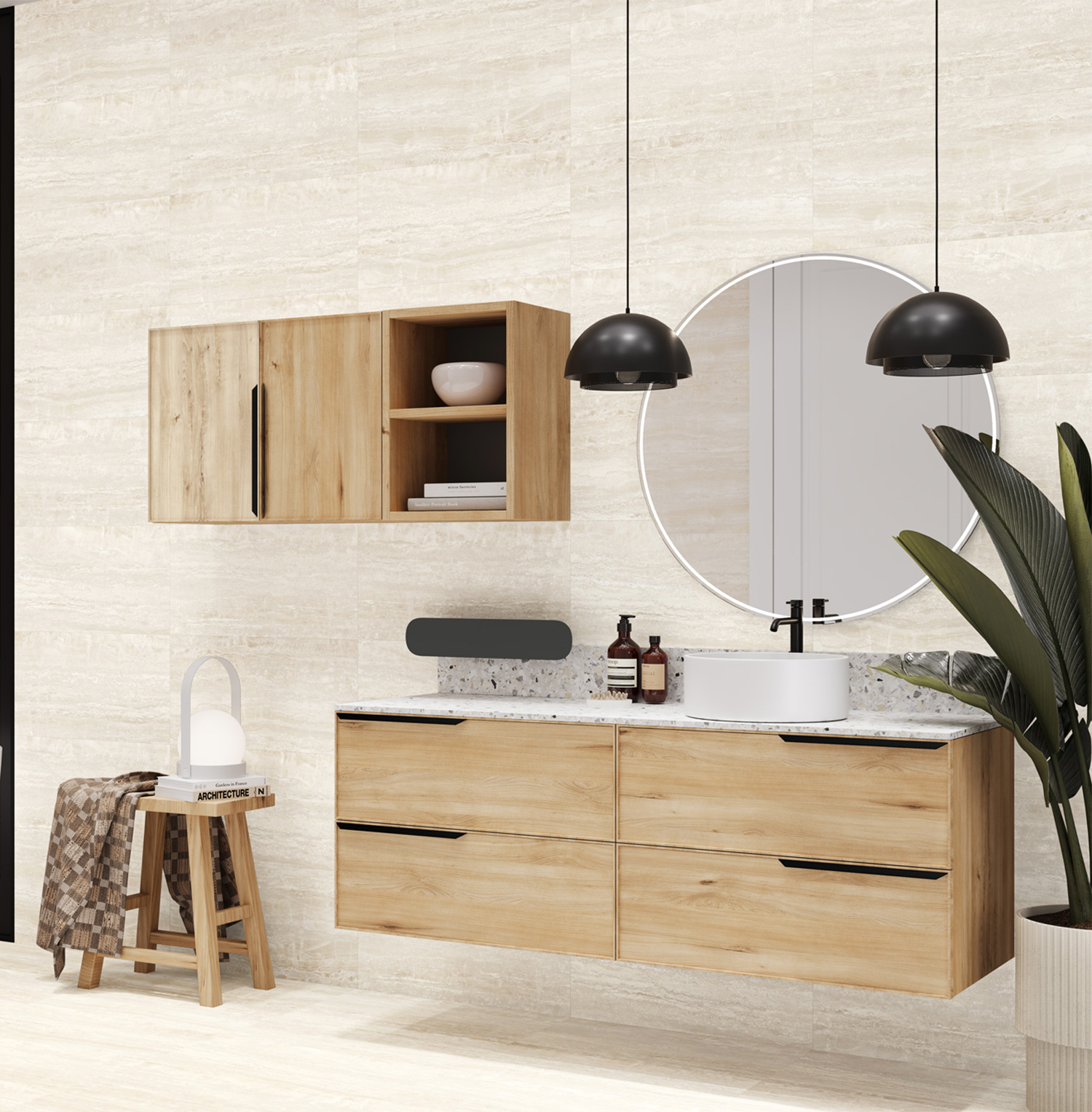 Модная коллекция под травертин в теплых оттенках. Травертин широко применяется в дизайне интерьеров благодаря своей природной красоте и универсальности. Такой вид мрамора прекрасно вписывается в различные стили, от классического до современного, и может стать ключевым элементом дизайна вашего пространства. Не ректифицированные края и матовая поверхность керамогранита подчеркивают натуральность и современность дизайна. Комбинация травертина коллекции Rim и текстурой дерева серии Goa создаст теплый и уютный интерьер с природной эстетикой. Такое сочетание идеально подходит для гостиных или загородных домов, добавляя интерьеру гармонии и тепла. Сочетание травертина и бетона из серии Flagman на разных стенах одного интерьера придаст интерьеру динамики и создаст современный интерьер с контрастом текстур. Это сочетание подойдет для офисов и городских квартир, добавляя интерьеру минимализма и стиля.