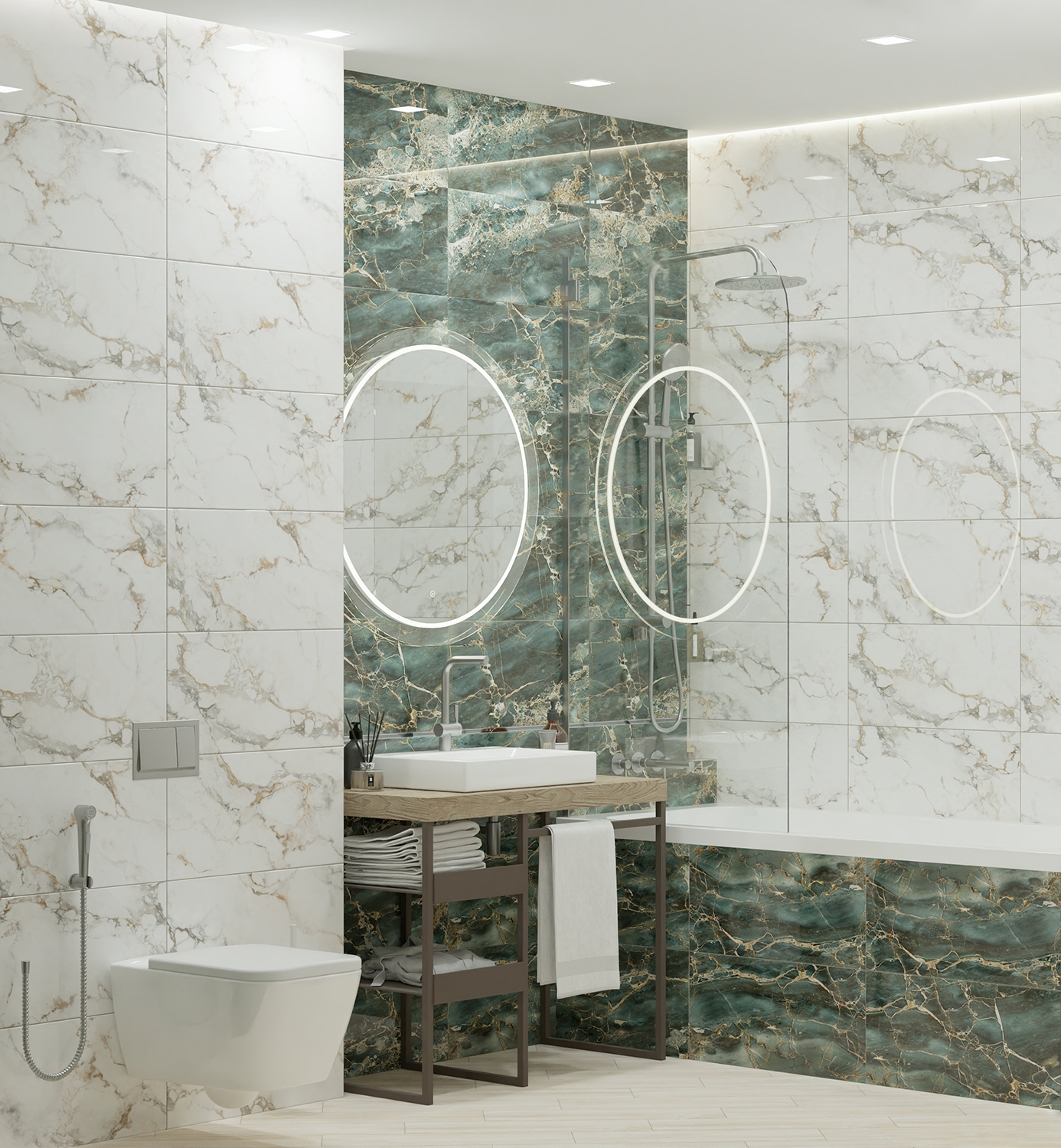 Коллекция Marigold представлена в двух гармоничных оттенках: зеленый - позволяет создать атмосферу свежести и природной гармонии, актуальной в современных интерьерах, а белый идеально подходит для тех, кто стремится к спокойствию и комфорту в своём пространстве. Керамические плиты имитируют мрамор с множеством золотых прожилок, которые словно лучи солнца, изящно пересекают поверхность, придавая плите глубину и изысканность. Формат коллекции 30х60 см обеспечивает универсальность в применении, что делает их идеальным выбором для создания интерьера.