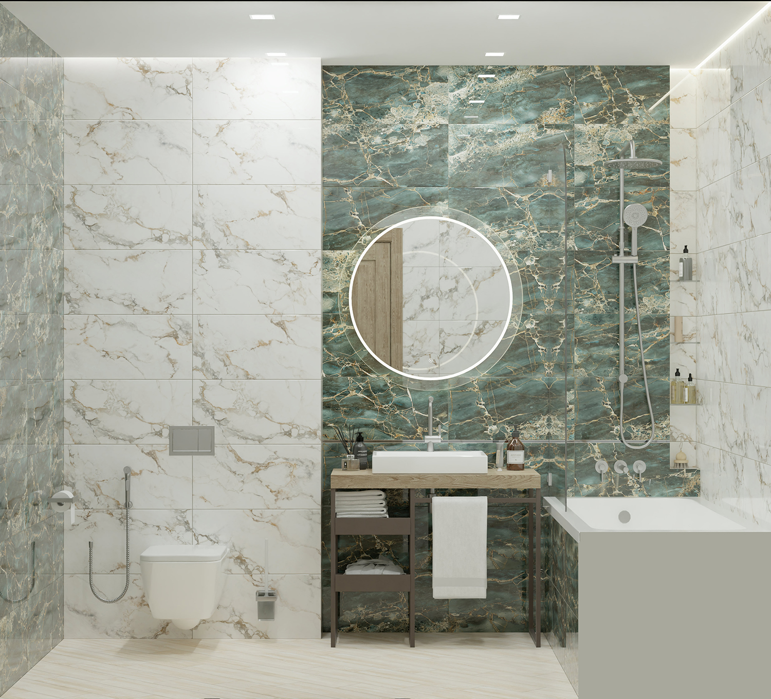 Коллекция Marigold представлена в двух гармоничных оттенках: зеленый - позволяет создать атмосферу свежести и природной гармонии, актуальной в современных интерьерах, а белый идеально подходит для тех, кто стремится к спокойствию и комфорту в своём пространстве. Керамические плиты имитируют мрамор с множеством золотых прожилок, которые словно лучи солнца, изящно пересекают поверхность, придавая плите глубину и изысканность. Формат коллекции 30х60 см обеспечивает универсальность в применении, что делает их идеальным выбором для создания интерьера.