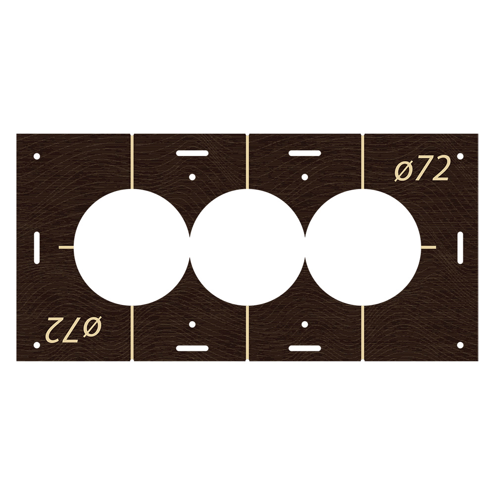 Шаблон для сверления подрозетников 72 мм на 3 отверстия. Используется для быстрого высверливания групповых отверстий под подрозетники. Межцентровое расстояние 71 мм. Шаблон скрепится к стене с помощью саморезов, дюбелей и т.д.(на черновых поверхностях) или при помощи двухстороннего скотча (на чистовых поверхностях) и можно сразу сверлить, предварительно сняв центровочные сверло с коронки. Групповые отверстия для подрозетников можно высверливать в стенах из камня, бетона, кирпича, керамогранита, плитки, блоков, гипсокартона, фанеры, дерева, керамики, стекла.