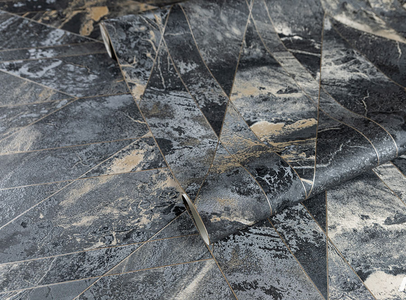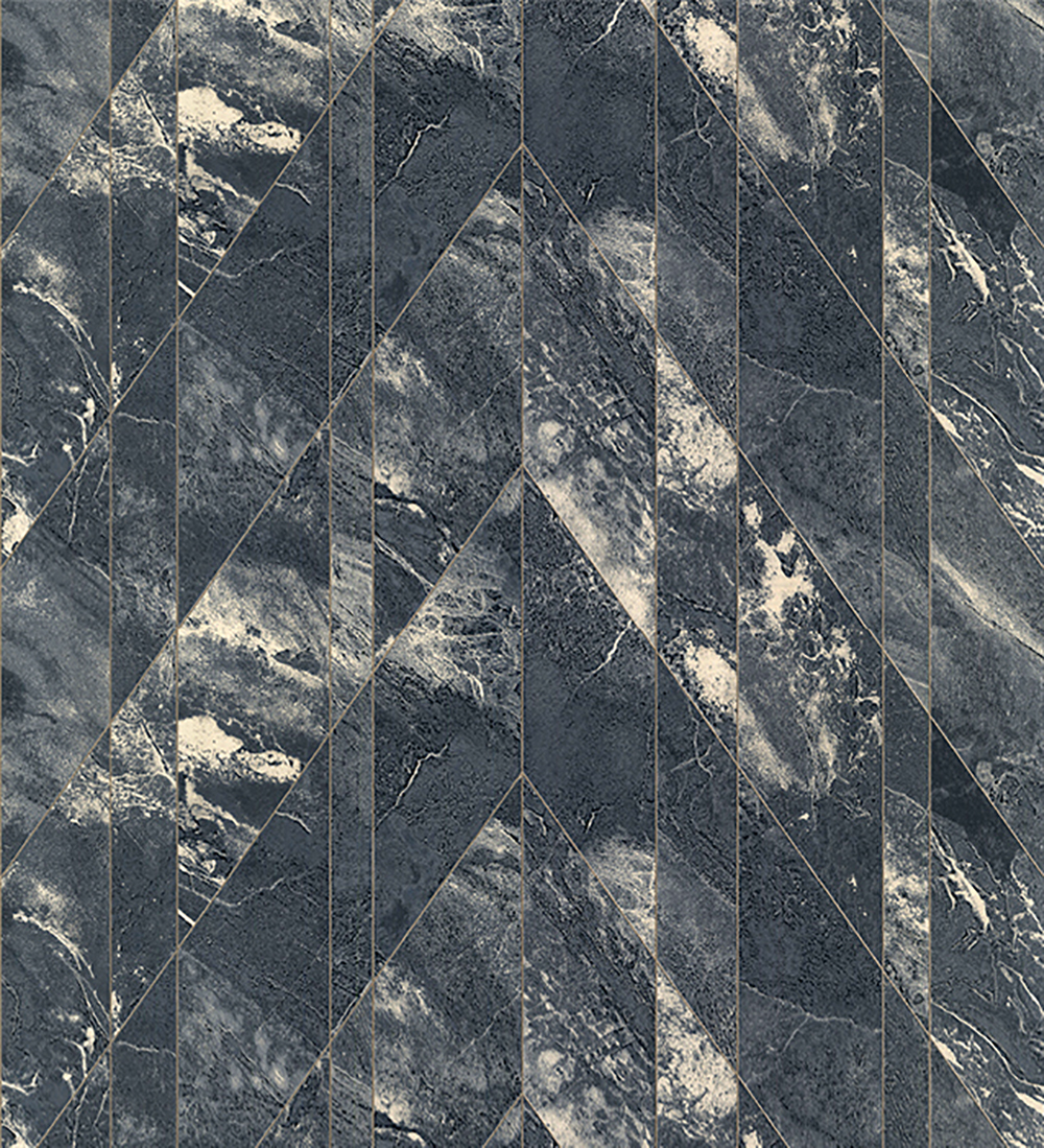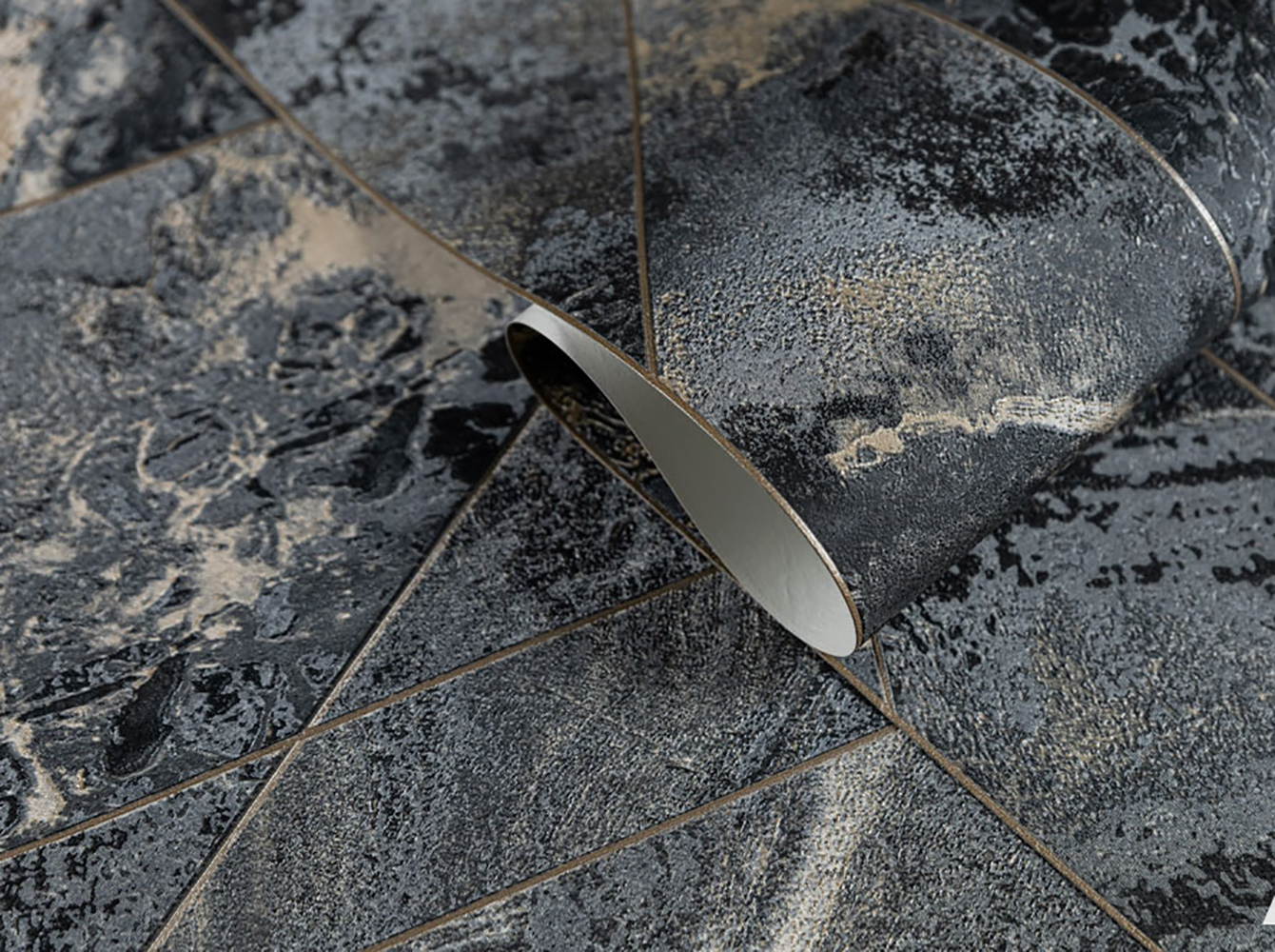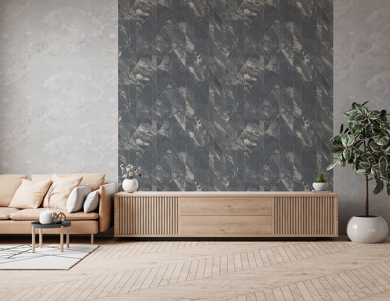 Имитация среза натурального камня создаёт тактильную основу, на которой проявляется геометрический принт. Лёгкий блеск фактурной поверхности привлекает внимание за счёт ненавязчивой игры света и тени. Благодаря такому приёму покрытия смотрятся дорого, но не кричат о своём превосходстве в интерьере.