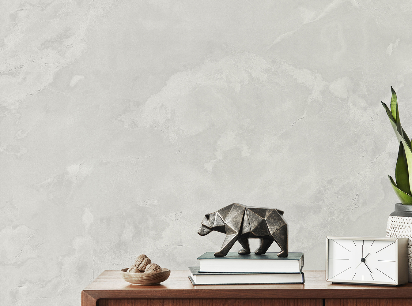 Имитация среза натурального камня создаёт тактильную основу, на которой проявляется геометрический принт. Лёгкий блеск фактурной поверхности привлекает внимание за счёт ненавязчивой игры света и тени. Благодаря такому приёму покрытия смотрятся дорого, но не кричат о своём превосходстве в интерьере.
