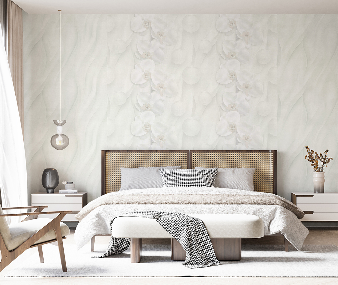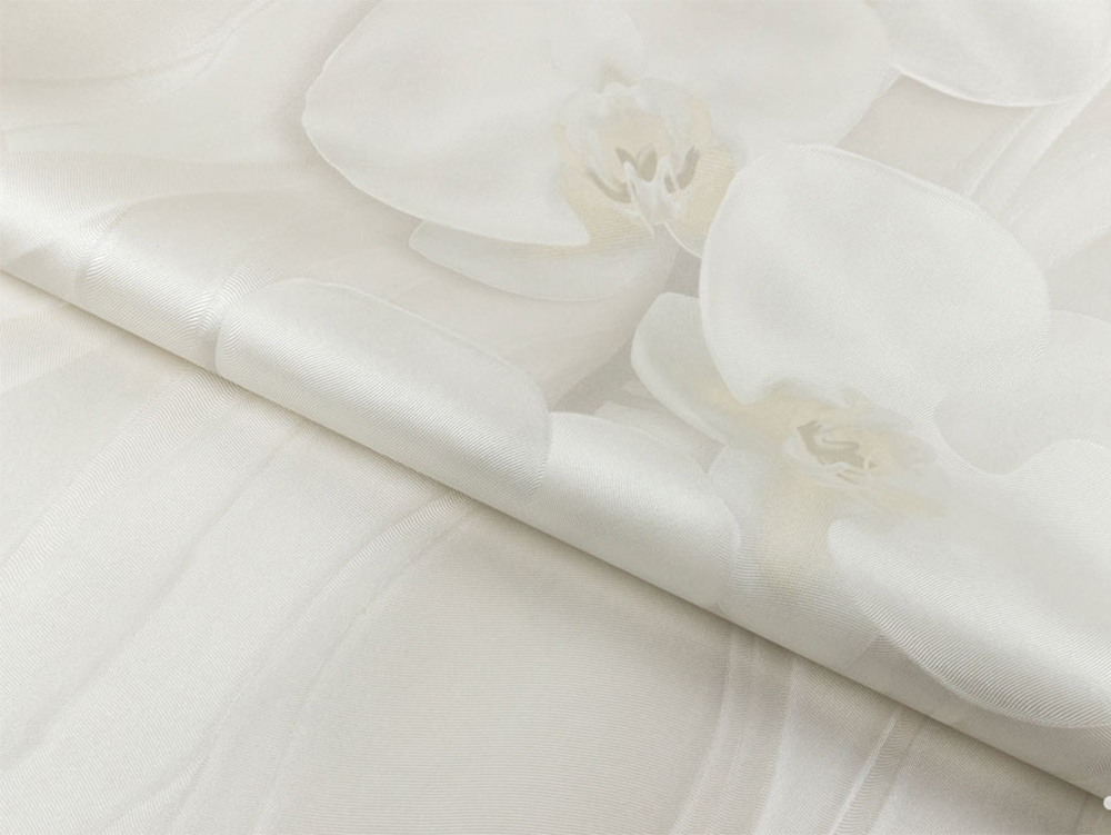 Основной принт новой коллекции «Линесса» – крупный цветок в окружении сферических форм. Элементы композиции словно парят в воздухе, создавая ощущение движения. Фон поддерживает эту иллюзию: плавные волны, нанесённые с тончайшей детализацией, создают эффект мягкого рельефа, словно ветер оставил на песке лёгкие, почти невидимые узоры. Шёлковая фактура со сдержанным блеском придает серии аристократическую изысканность и благородство.