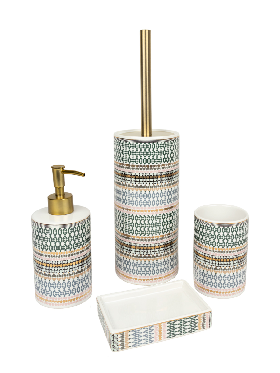 Все предметы коллекции разработаны с учетом функциональности и простоты использования. Этнический орнамент добавит особую атмосферу и изюминку вашему интерьеру. Необычный принт не единственное достоинство данного набора, список можно дополнить такими преимуществами, как удобная форма, экологически чистый материал, устойчивость к перепадам температур в ванной комнате.