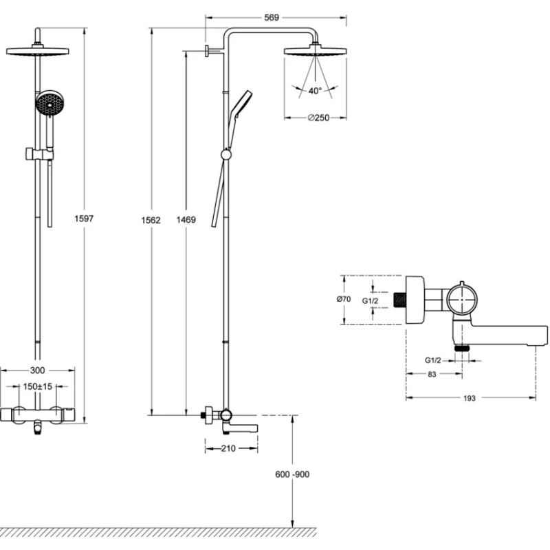 Верхний душ представлен круглым элементом диаметром 25 сантиметров. Он обеспечивает мягкий, приятный дождь ("Rain") и равномерно распределяет воду по всей поверхности тела. Ручная лейка, имеющая меньший размер (диаметром 9 см), дополнительно расширяет возможности выбора режимов. Она способна менять интенсивность струи и адаптироваться под индивидуальные предпочтения пользователей.
