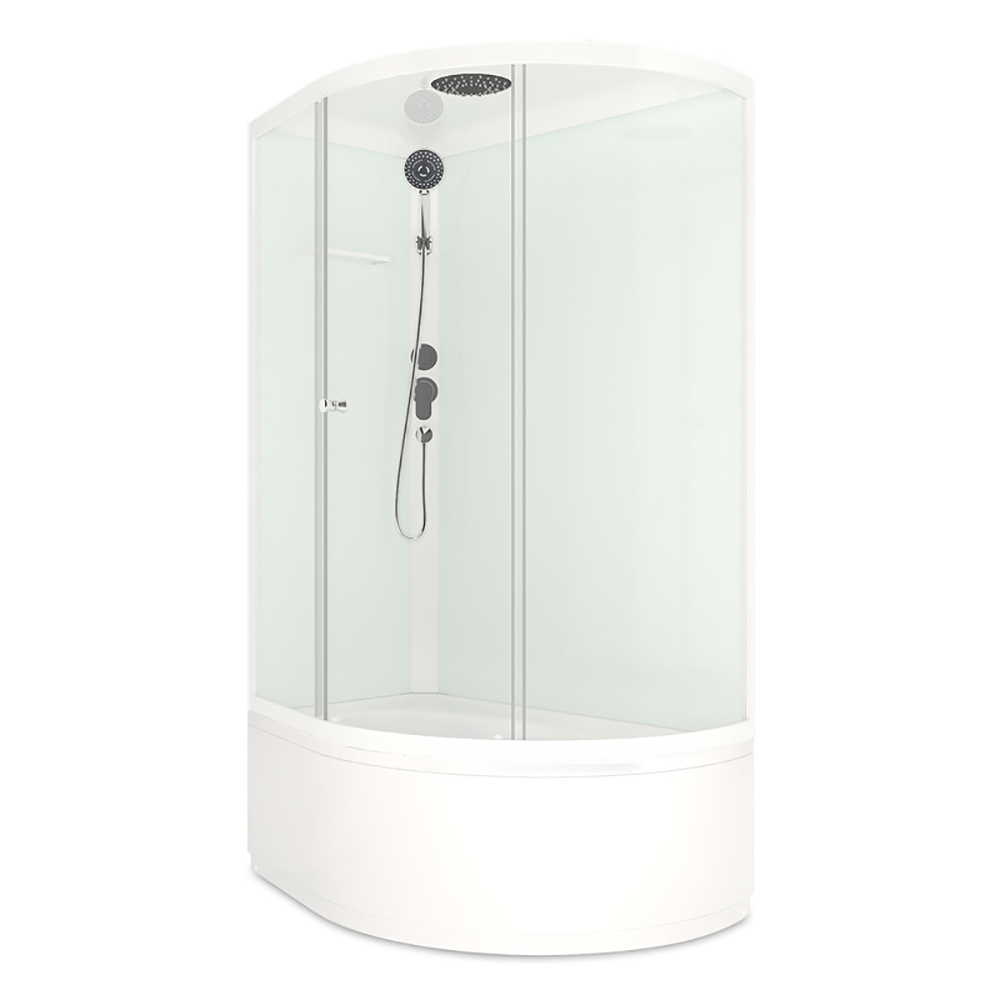 Угловая душевая кабина 120х80 со стекляными матовыми стеклами (угол слева), белыми стенками и профилем.<br> Высокий поддон. В комплекте смеситель, верхний душ и ручной душ на гибком шланге. Полочка для ванных принадлежностей. <br>Душевая кабина укомплектована сливными кнопками с системой забора волос и другого мусора, что позволяет сократить денежные расходы, связанные с чисткой или заменой канализации. Поддон усилен сплошной плитой ДСП 16 мм. Поддон, стенки и крыша изготовлены из прочного санитарного акрила.