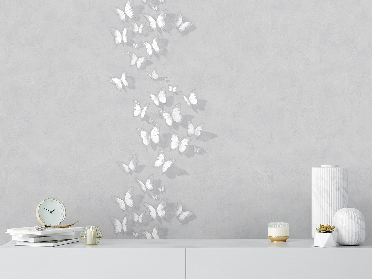 Представьте коллекцию, погружающую в мир, где магия и природа сливаются. Миниатюрные бабочки, словно созданные из света, танцуют на фоне стены, вызывая восхищение своими тонкими деталями и реалистичностью изображения. Эти бабочки словно из лесов эльфов или садов фей, символизируют мечты и свободу, настраивая на позитивный лад. Соберите свою коллекцию идей в спальне, где спокойствие и уединение сочетаются с загадкой бабочек, или создайте весёлую атмосферу в детской комнате, где каждая бабочка станет верным спутником маленького искателя приключений. С таким декором ваш дом будет не просто местом, а настоящим пространством для мечтаний и самовыражения. В качестве базы мы используем приятную ровную матовую бетон-штукатурку.