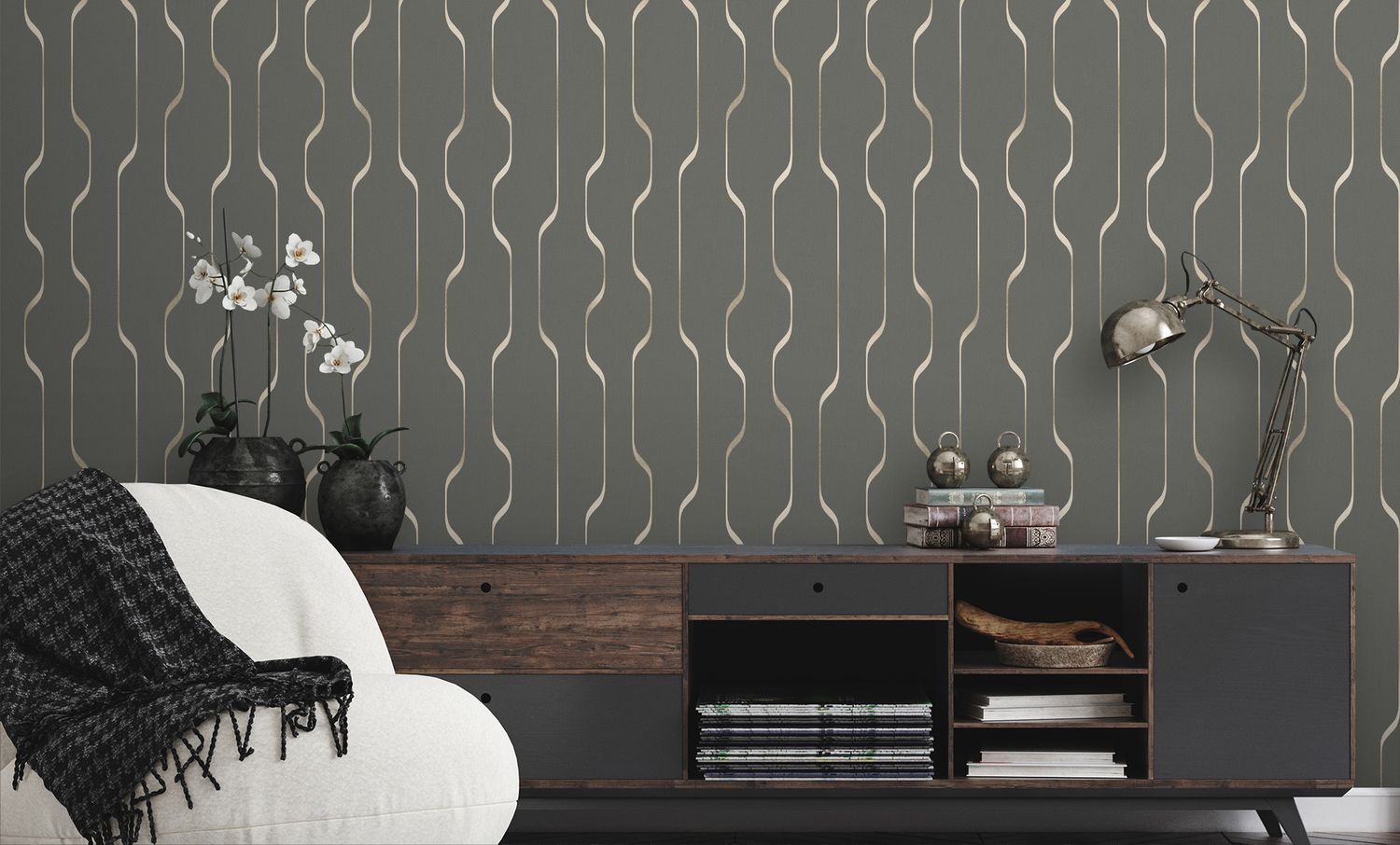 Брутальная коллекция обоев Director — это актуальная геометрия в дизайнерском прочтении. Современный дизайн в виде плавных линий с переливающимися серебристыми акцентами создает оптический объем, визуально расширяет пространство, добавляя ему глубину и мягкую динамику.