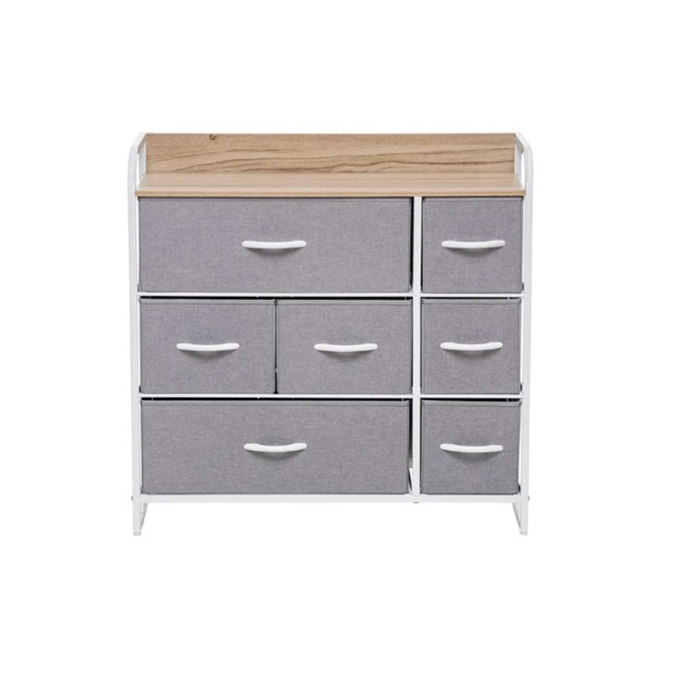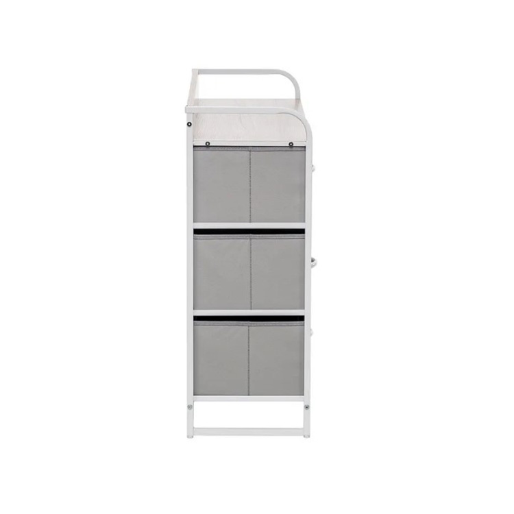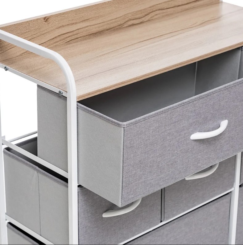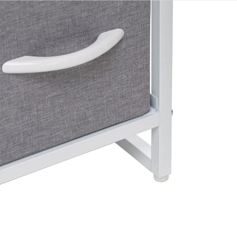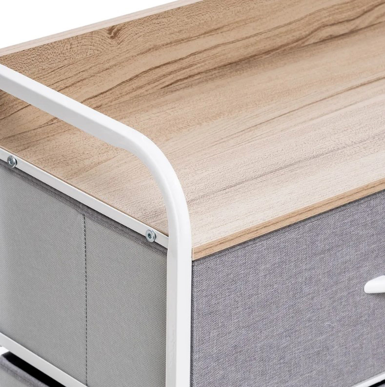 Этот модульный комод получил стальной каркас и надежные пластиковые ножки, которые сберегут пол. Изготовленные из дышащего нетканого материала ящички с деревянными ручками станут удобным хранилищем для разнообразных вещей. Наличие водостойкой верхней панели из МДФ позволит использовать элемент мебели как пеленальный комод или место для экспозиции декоративных элементов.