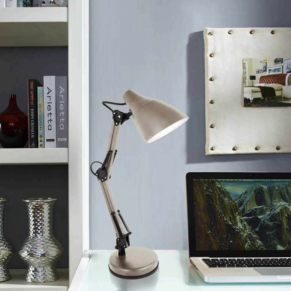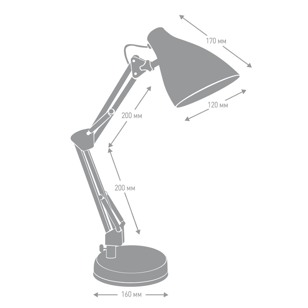 Светильник KD-331 - универсальный вариант для освещения рабочих мест, мест для чтения и учебы. Может использоваться как в офисных интерьерах, так и дома. Подходит для освещения спальни на прикроватной тумбе и декоративной подсветки в интерьерах разных стилей. Двухзвенная металлическая стойка и основание защищают светильник от опрокидывания, а плафон в форме шара из металла надежно фиксируется винтовыми зажимами в нужном положении. Регулируется по высоте и углу наклона.