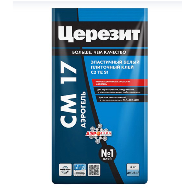 Клей Церезит CM 17 Аэрогель предназначен для крепления плит из натурального камня, клинкера, керамогранита и керамики на сложные и деформирующиеся основания как внутри, так и снаружи помещений любого назначения. Рекомендован для подогреваемых поверхностей и плит особо крупного формата (>1x1 м). Продукт имеет белый цвет, что позволяет использовать его для монтажа тонкого мрамора, светлого известняка, травертина, стеклянной плитки и аналогичных материалов, чувствительных к цвету клеевой смеси. Обладает высокой адгезией к различным основаниям, предотвращает сползание плитки с вертикальных поверхностей, сохраняет умеренную эластичность после высыхания. Увеличенная жизнеспособность раствора и длительное открытое время увеличивают производительность труда профессиональных исполнителей, а также способствуют более качественному выполнению работ домашними мастерами.