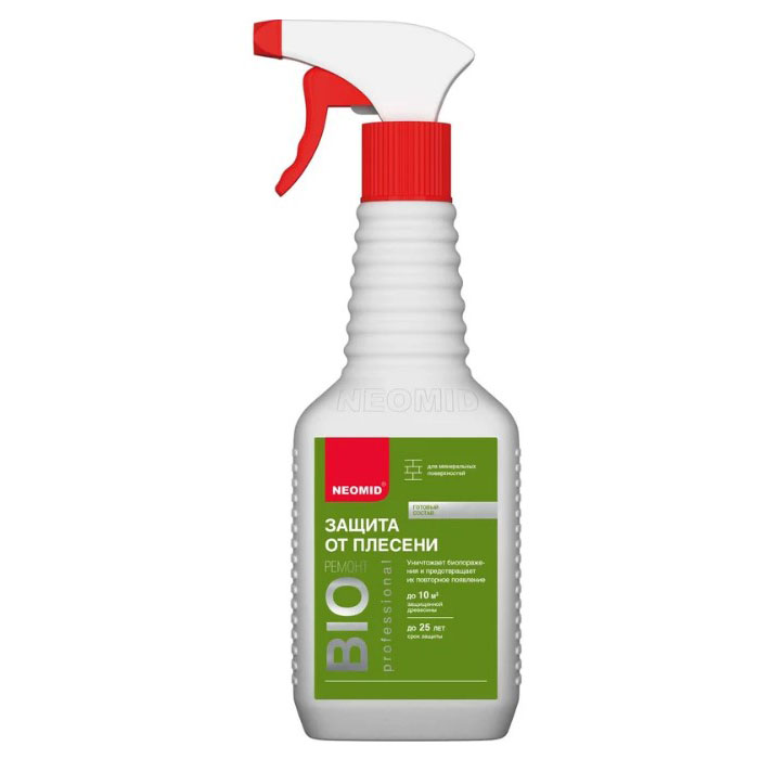 Готовое средство для защиты от плесени Neomid Н-BioРем-0.5/гот/тр. защищает строительные материалы на минеральной основе от бактерий, плесневых грибов, мхов и лишайников. Используется как внутри, так и снаружи помещений. Рекомендуется для обработки поверхностей перед шпатлевкой, покраской, поклейков обоев и прочих работ.