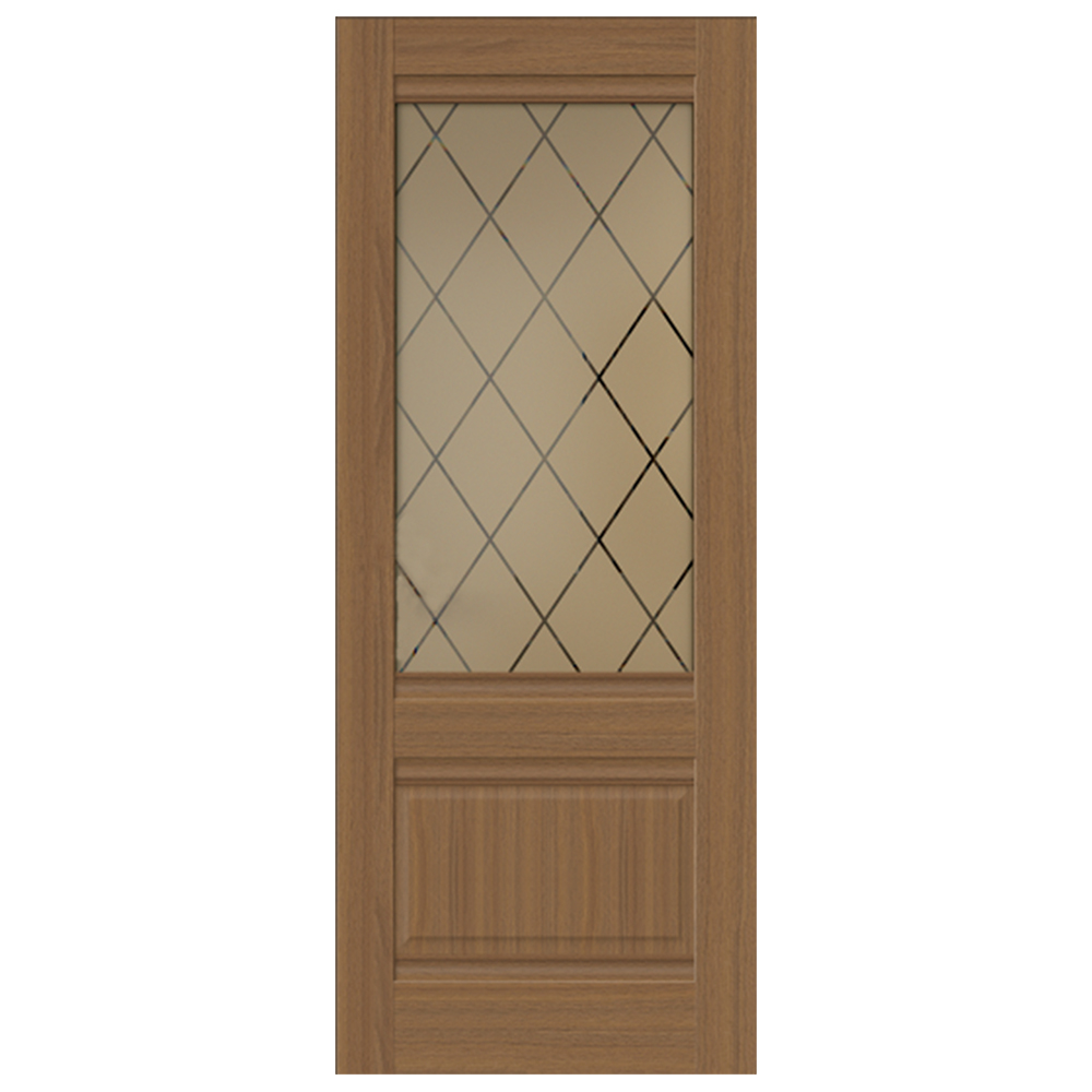 Межкомнатное царговое полотно, остекленное, универсальное. Покрытие Softwood (ПВХ), гладкое, матовое. Обвязка полотна из царговых элементов. Внутренняя наборка - фигурная филенка + стекло частично матированное, бронза, рисунок Ромб. Полотно поставляется без фурнитуры и врезки под нее. Используется бескромочная технология.