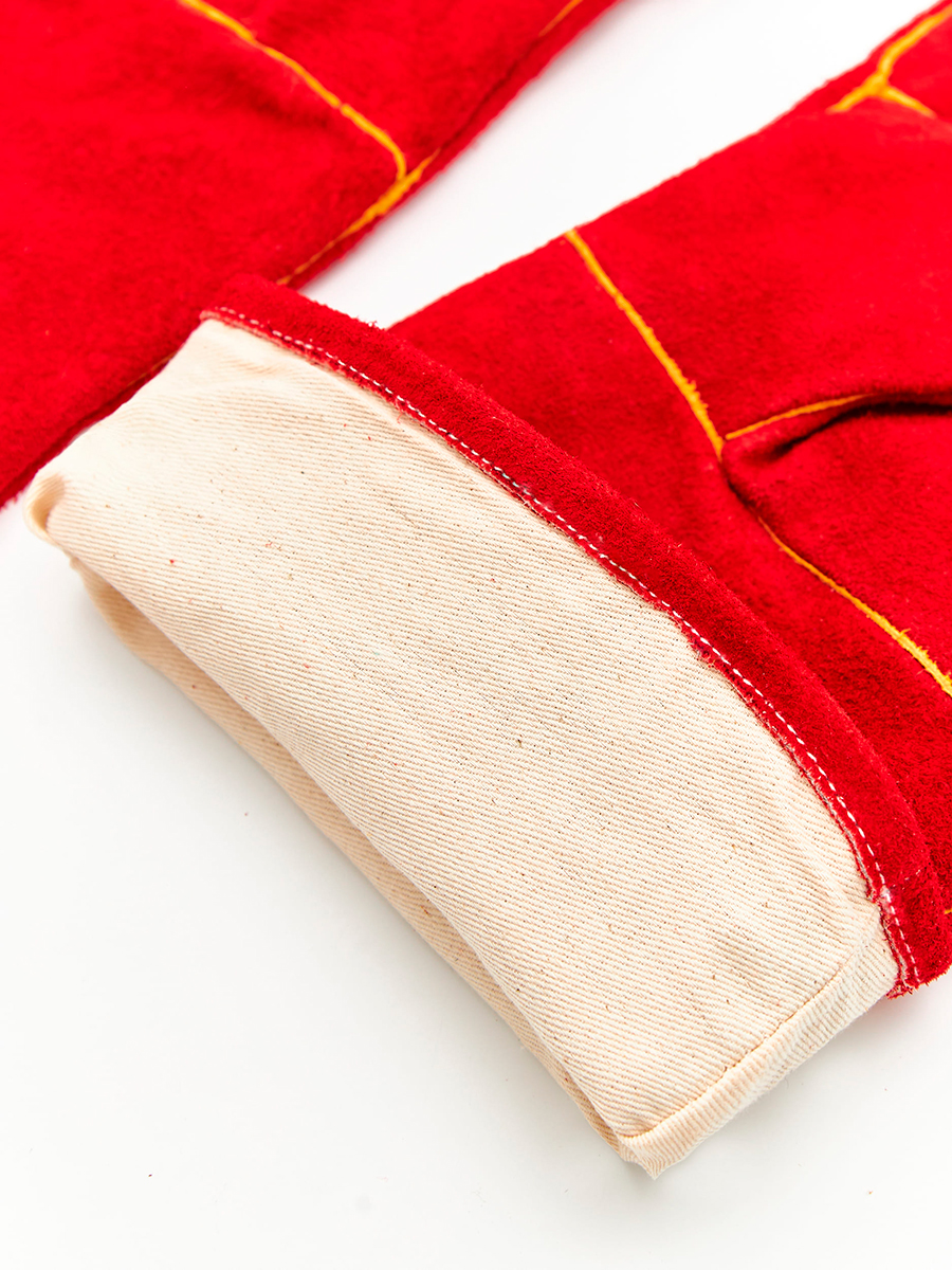 Перчатки сварщика (краги) спилковые для защиты от механических воздействий и повышенных температур. Перчатки с подкладкой из хлопка, длина 350 мм (+10/-5мм), обработка, обеспечивающая сохранение мягкости спилка в течение длительного времени хранения. Окрашенный спилок КРС сорта АВ (1,4 +/-0,2 мм), швы усилены вставками из кожи, используется специальная упрочненная нить.