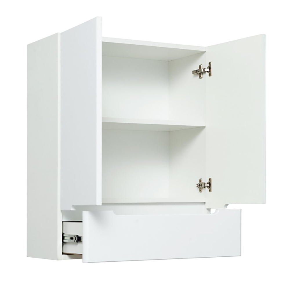 Шкафчик в ванную ПАРМА (навесной) выполнен в традиционном и всегда модном белом цвете и гармонично впишется в любой интерьер ванной комнаты. Шкаф в ванную имеет две распашные дверцы и нижний выдвижной ящик на шариковых направляющих. В комплекте идут петли со встроенным доводчиком. В шкафу имеется одна встроенная полка.