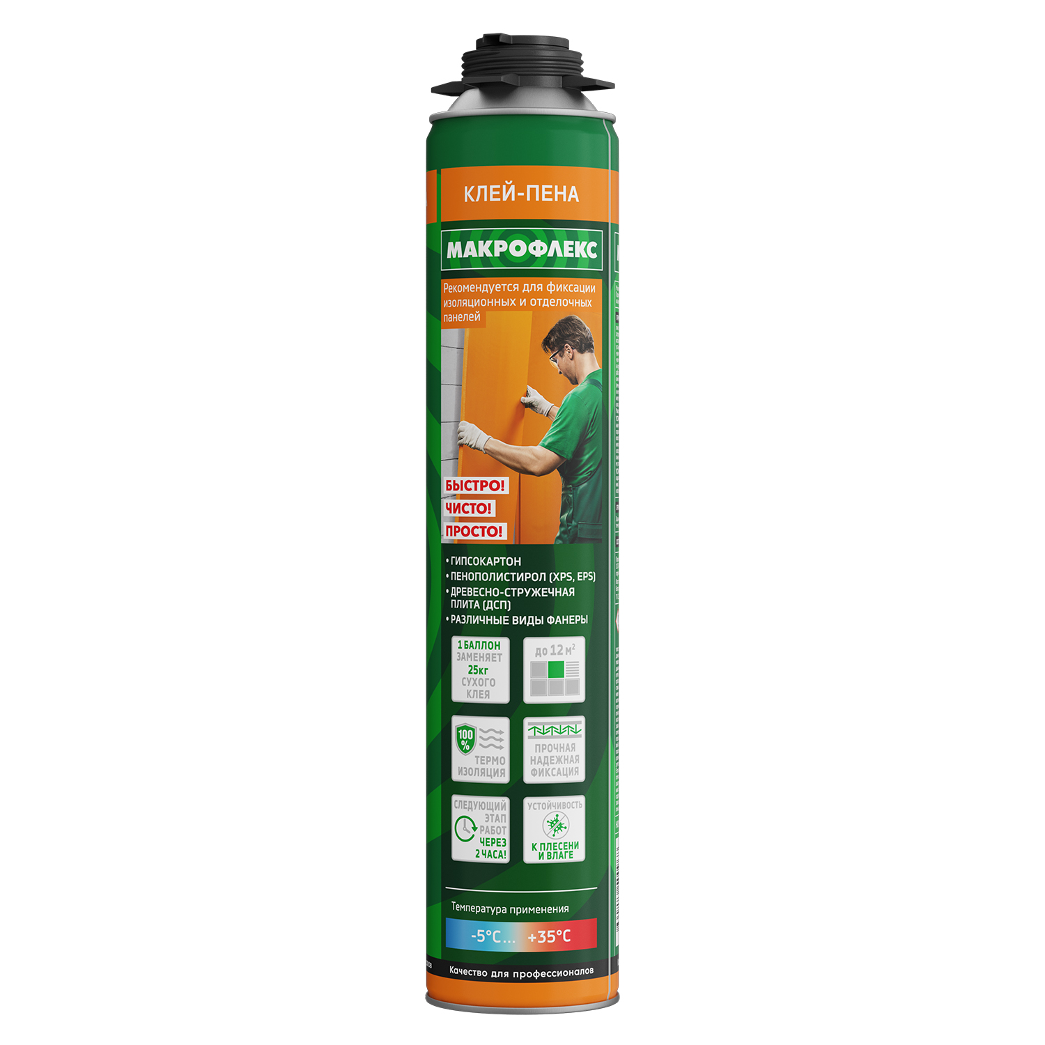 Клей-пена ПРО Макрофлекс рекомендуется для фиксации изоляционных и отделочных панелей. Подходит для работы с гипсокартоном, пенополистиролом (XPS, RPS), ДСП и различными видами фанеры. Клей-пена позволяет выполнить работу значительно меньшими усилиями и помогает вдвое сократить затрачиваемое на работу время.
