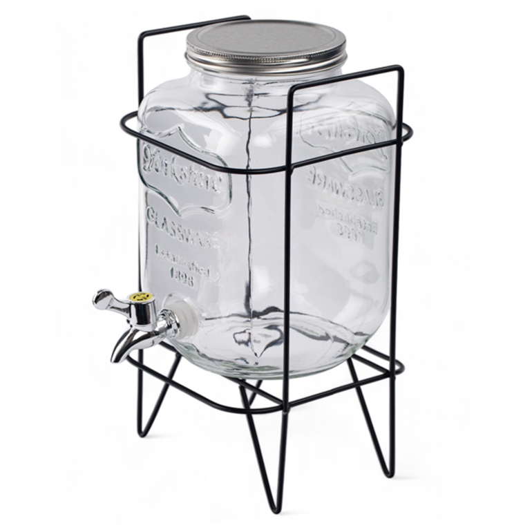 Банка с краником/лимонадница YORKSHIRE (4 л) на металлической подставкес краном на подставке — это идеальное решение для хранения и подачи лимонада, морса или других напитков. Ёмкость выполнена из высококачественного стекла и оснащена металлическим краном, который обеспечивает удобство использования и предотвращает протекание жидкости. Благодаря стильному дизайну и компактным размерам банка станет прекрасным дополнением к сервировке стола на даче, пикнике или вечеринке. Она также подойдёт для использования в домашнем баре или кафе.
