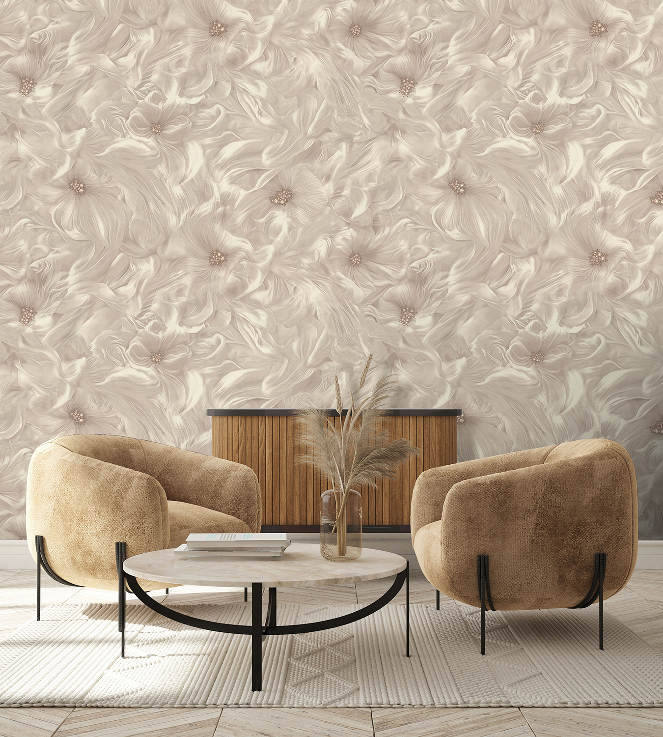 Коллекция обоев «Mia» основана на нежном и изысканном цветочном дизайне. Главный мотив этой коллекции — цветы с развевающимися лепестками, созданными с вниманием к деталям, словно их лепестки сотканы из самого лучшего шелка. Их движение напоминает легкое парение ткани под водой, что придаёт рисунку ощущение легкости и воздушности. Сердцевины цветов оформлены глиттером, они сияют, словно россыпь драгоценностей, привлекая своим блеском.