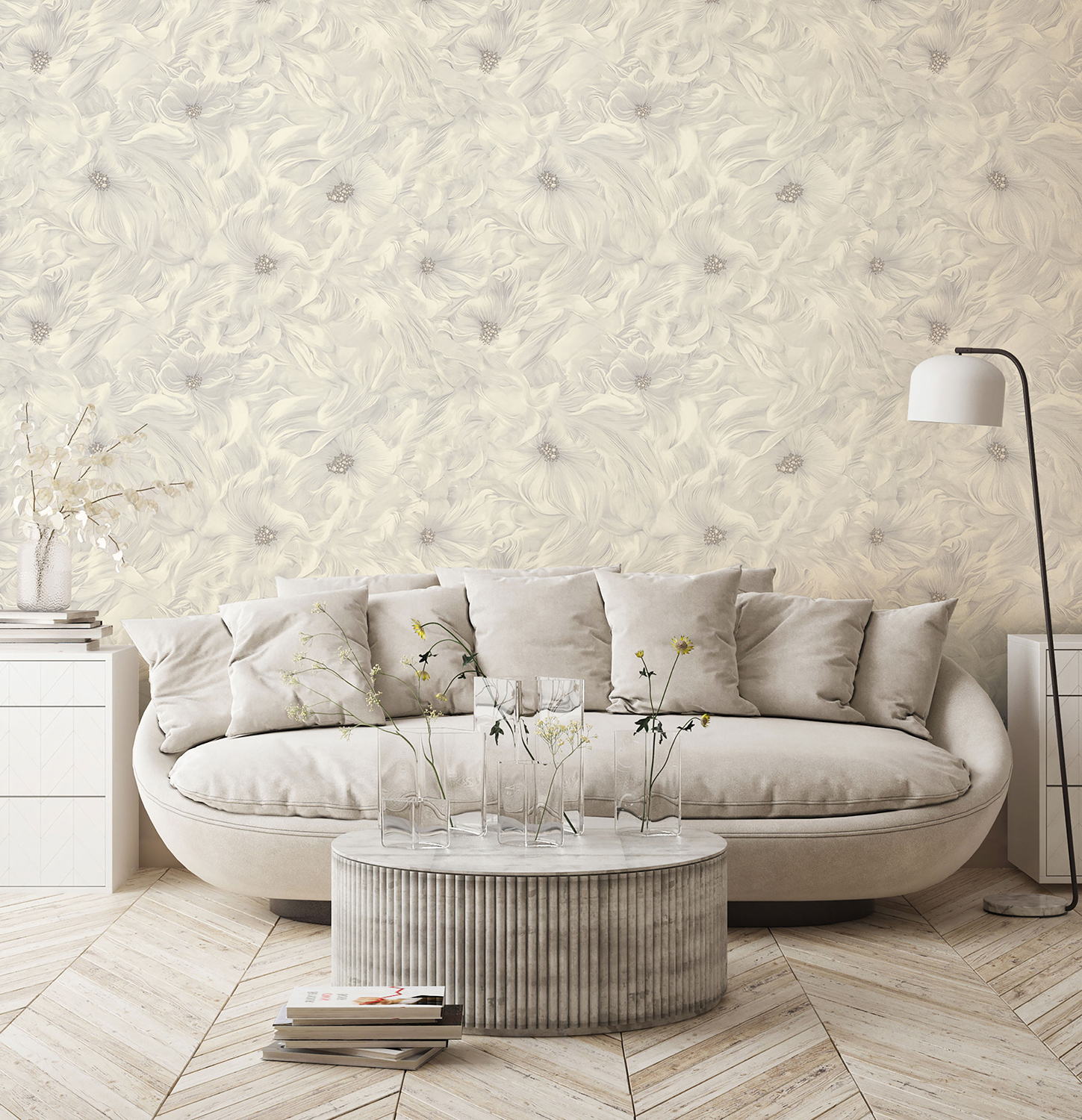 Коллекция обоев «Mia» основана на нежном и изысканном цветочном дизайне. Главный мотив этой коллекции — цветы с развевающимися лепестками, созданными с вниманием к деталям, словно их лепестки сотканы из самого лучшего шелка. Их движение напоминает легкое парение ткани под водой, что придаёт рисунку ощущение легкости и воздушности. Сердцевины цветов оформлены глиттером, они сияют, словно россыпь драгоценностей, привлекая своим блеском.