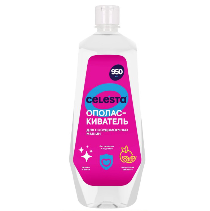 Ополаскиватель для посудомоечных машин CELESTA устраняет остатки моющих веществ со стенок посуды и посудомоечной машины. Способствует быстрому высыханию посуды без образования разводов на поверхности, следов и подтеков, придавая ей блеск и сияние. В составе натуральная лимонная кислота. Легкий цитрусовый аромат, нейтрализуюет запахи. Объем 950мл
