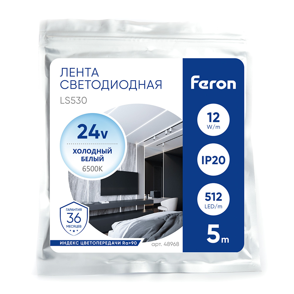 Лента имеет холодный белый свет с цветовой температурой 6500К. Она выполнена с классом защиты IP20, что обеспечивает ее безопасное использование внутри помещений. Лента обладает высоким индексом светопередачи, что позволяет передавать цвета с высокой точностью.