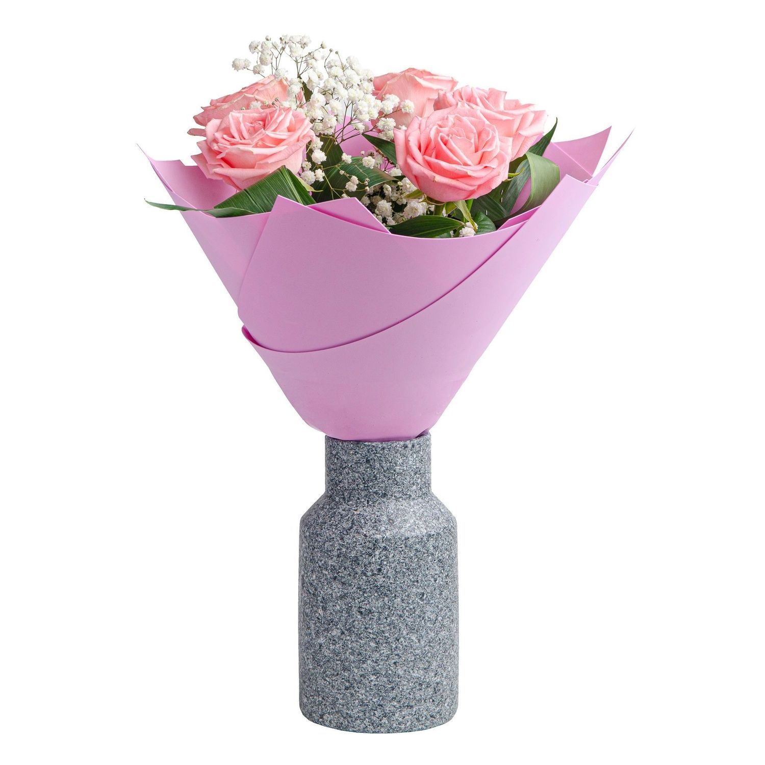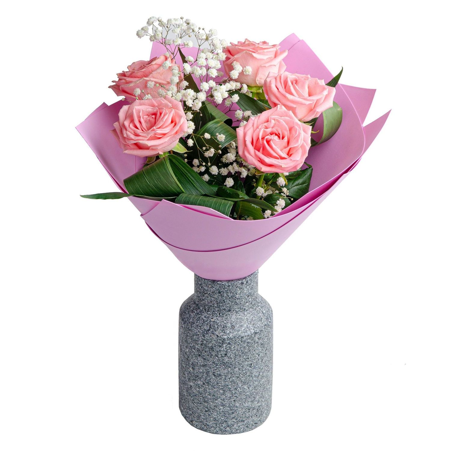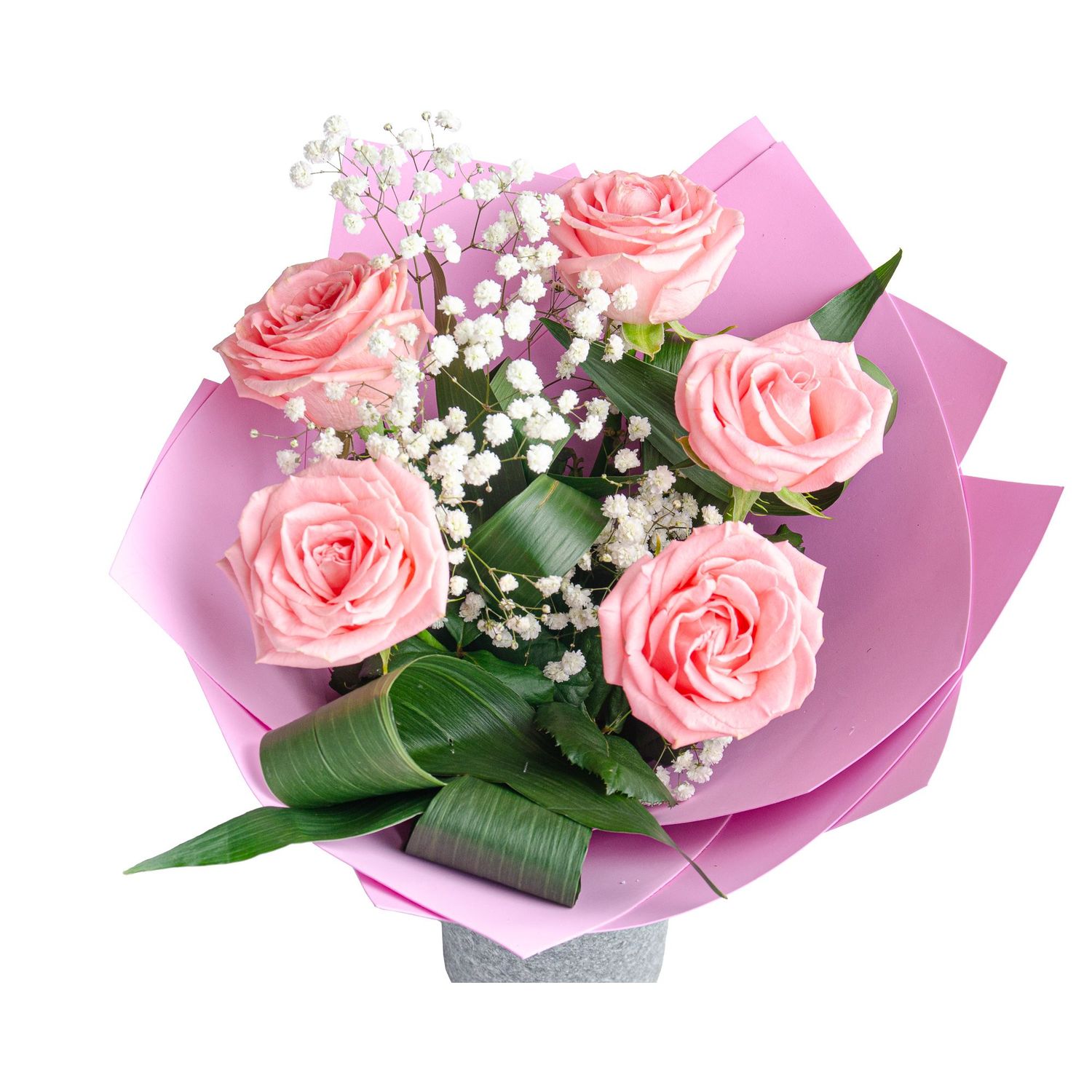 Букет из 5 розовых роз — нежное и романтичное воплощение элегантности. Розы мягкого розового оттенка символизируют восхищение, грацию и искренние чувства. Каждый бутон пышный и свежий, обрамлённый бархатистыми лепестками, которые постепенно раскрываются, даря лёгкий цветочный аромат. Букет оформлен в классическом стиле: розы аккуратно собраны и дополнены зелёным обрамлением, что подчеркивает их нежность. Идеальный подарок для любимого человека, подруги или мамы — он выразит вашу заботу и теплоту без слов. Завершает композицию стильная упаковка в тон: плёнка или крафт-бумага с лентой. Такой букет станет трогательным сюрпризом к любому поводу!