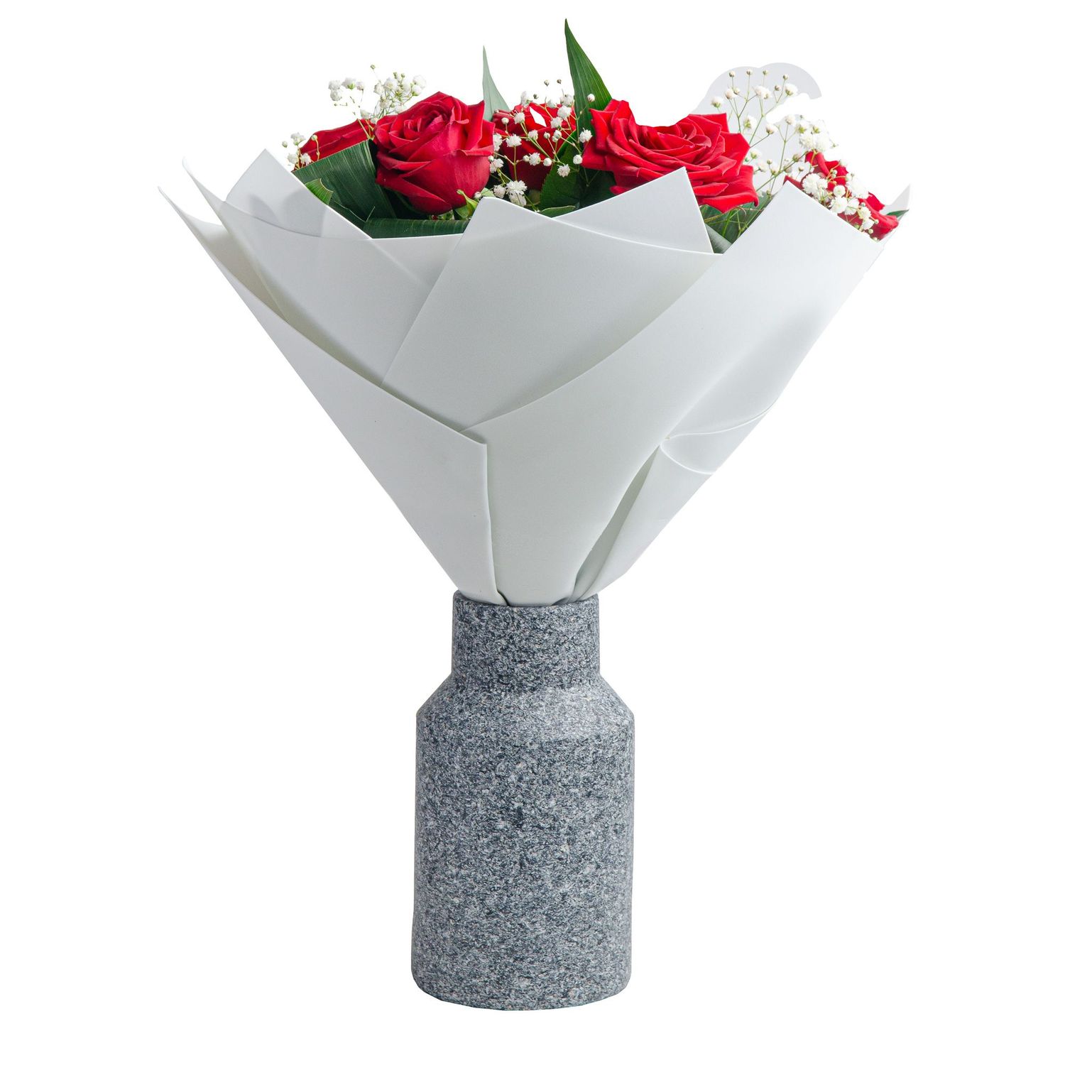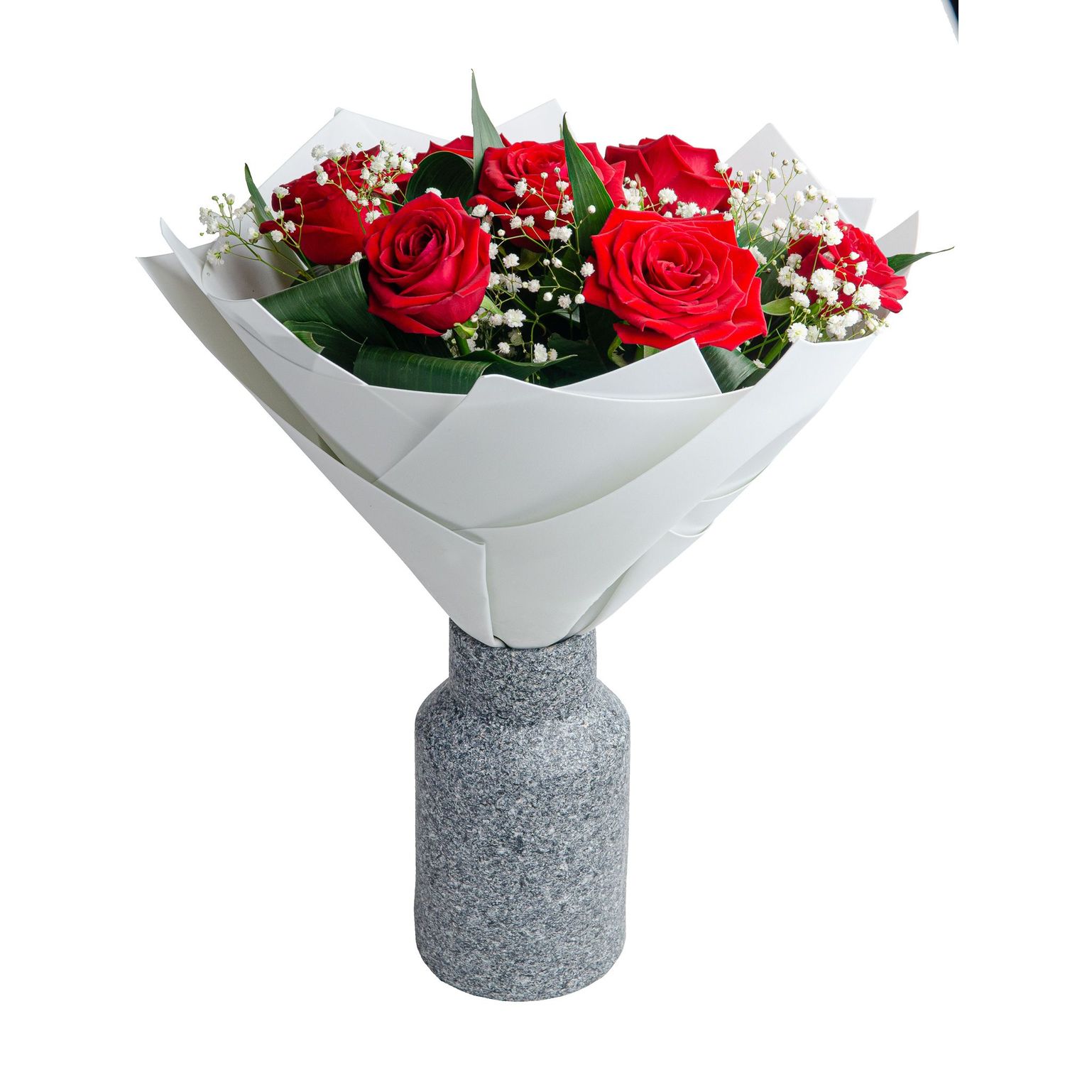 Букет собран в элегантной округлой форме, подчеркнутой сочной зеленью, которая оттеняет насыщенный цвет роз. Идеальный выбор для признания в любви, романтического свидания или важного события. Завершает композицию стильная упаковка — чёрная плёнка, крафт-бумага или атласные ленты, добавляющие благородный штрих.