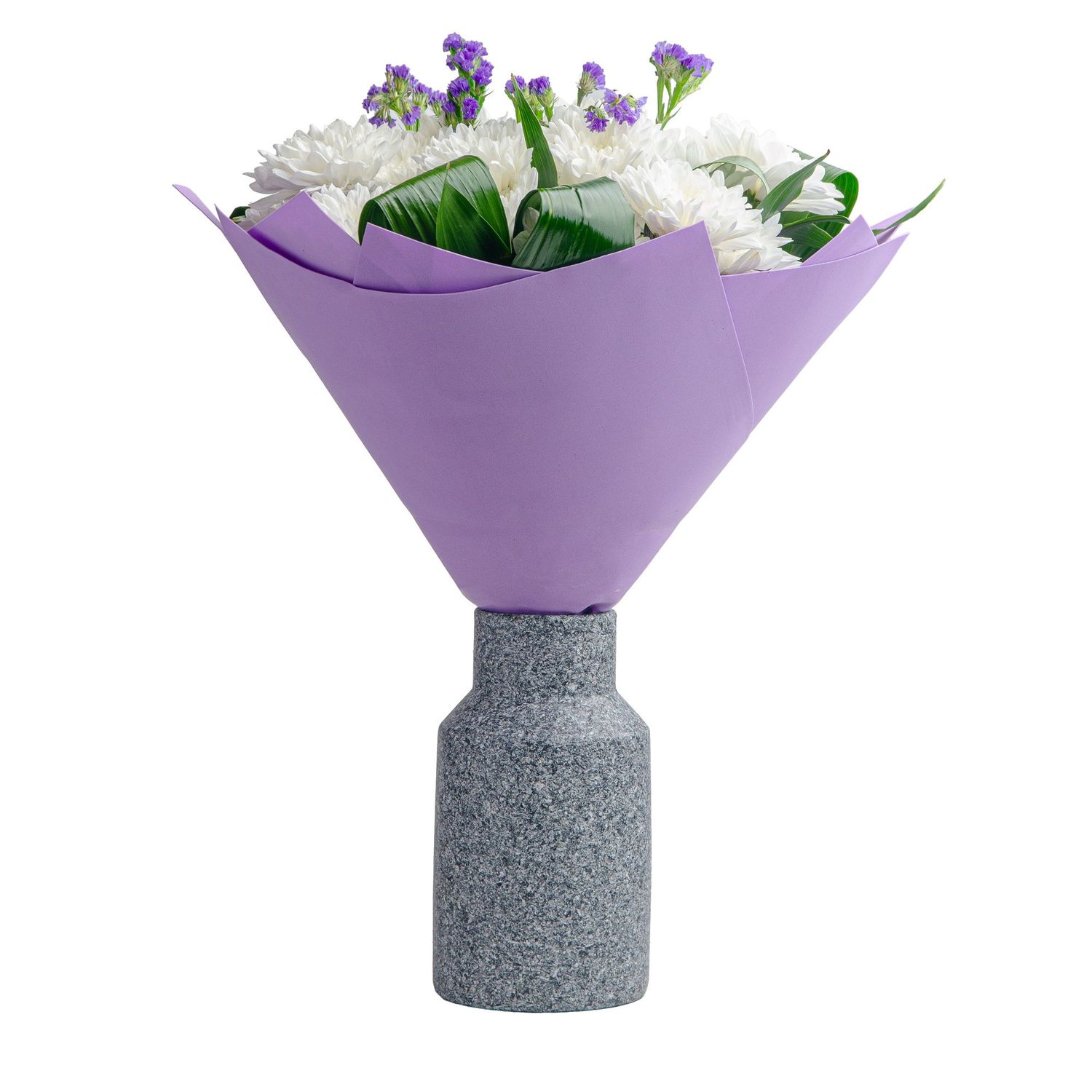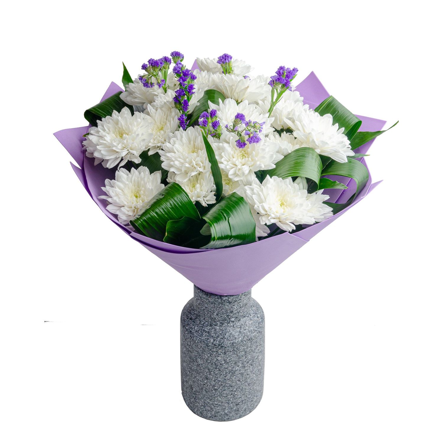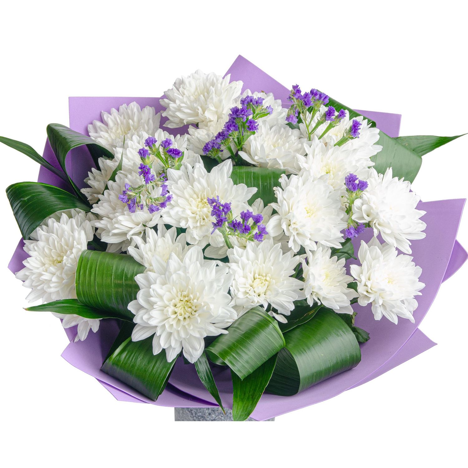 Букет из белых хризантем — воплощение чистоты, нежности и светлой гармонии. Пышные шаровидные соцветия с множеством лепестков словно излучают мягкое сияние, символизируя искренность, доброту и благородство. Их снежно-белый оттенок придаёт композиции элегантность и универсальность, делая букет уместным в любой ситуации.