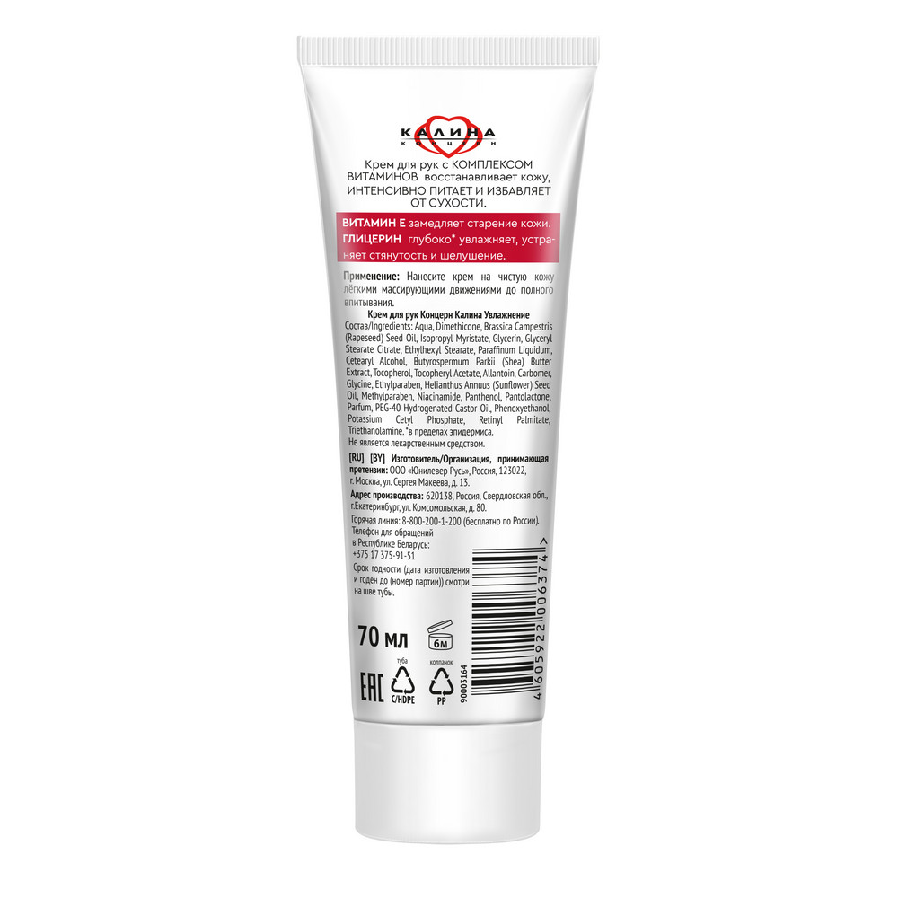 Крем для рук от концерна КАЛИНА Увлажнение – это эффективное средство для ежедневного ухода за кожей. В составе продукта натуральные ингредиенты, комплекс витаминов и глицерин, которые помогают восстановить кожу, обеспечивают интенсивное питание и устраняют сухость.