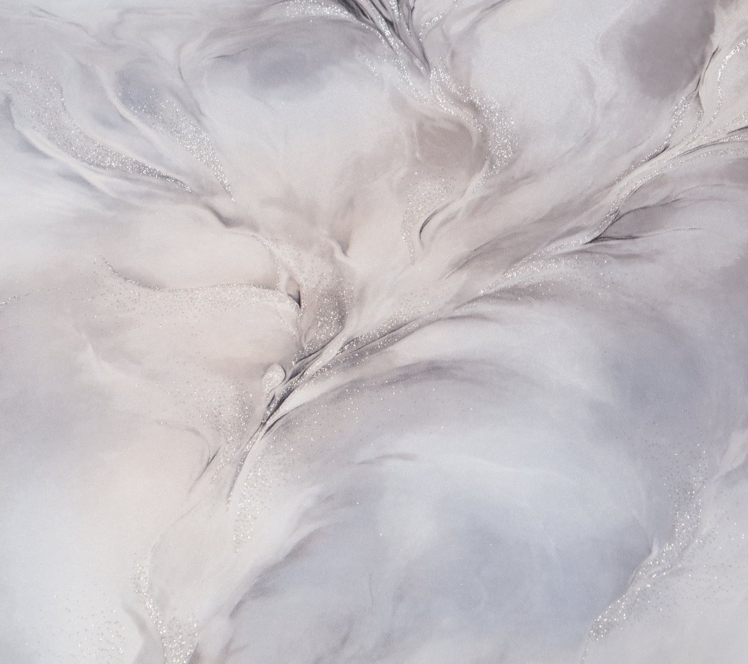 Художественный мотив выполнен в популярной технике современной живописи флюид арт. Жидкие акриловые краски красиво растекаются и смешиваются на полотне, рождают завораживающий объем волшебных узоров…О которых с трепетным восторгом говорят The Best. Деликатный перламутр и блестящие дорожки глиттера приятно переливаются на свету. Структура фона смотрится как дымчатое панно, где прозрачные слои краски создают эффект многослойной вуали. Она напоминает дымку, облако или утренний туман, который рассеивается под лучами солнца.