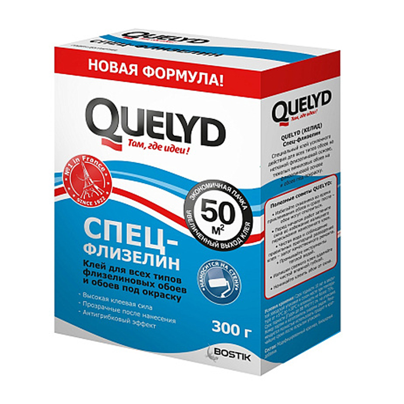 Клей QUELYD Спец-винил предназначен для приклеивания всех видов текстильных, виниловых (структурных, с использованием шелкографии, вспененных рельефных обоев), а также специальных обоев.