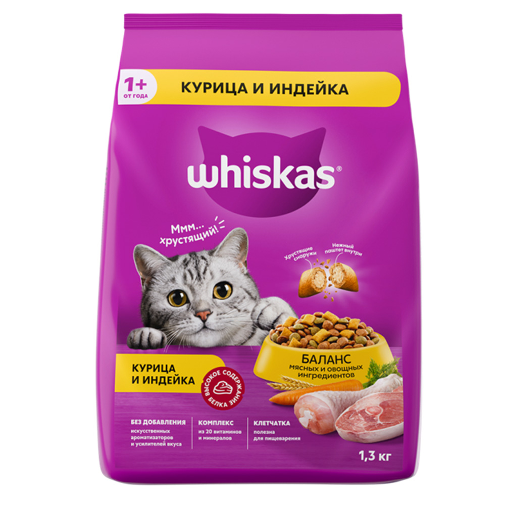 Корм для кошек WHISKAS Подушечки с курицей и индейкой 1,3кг