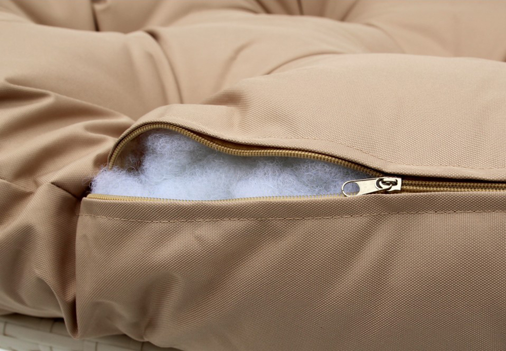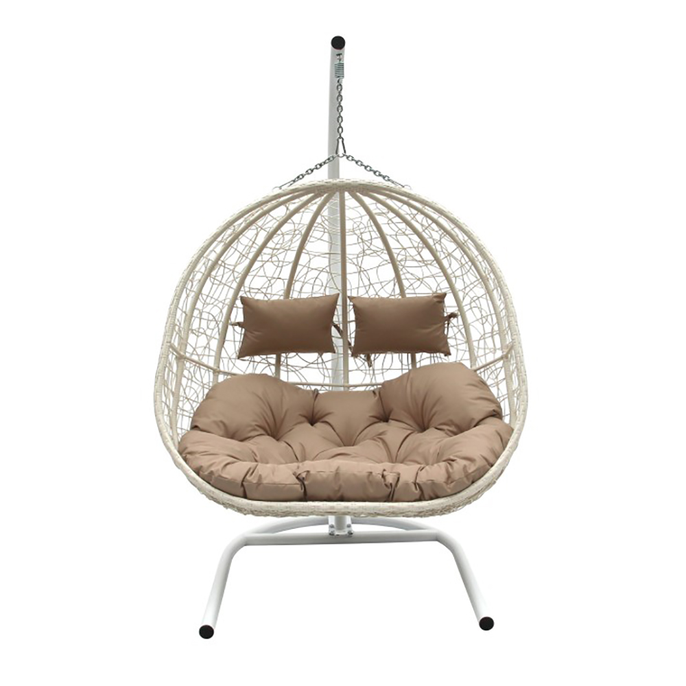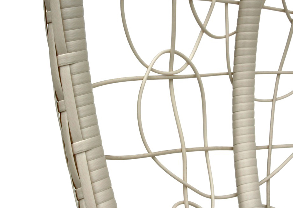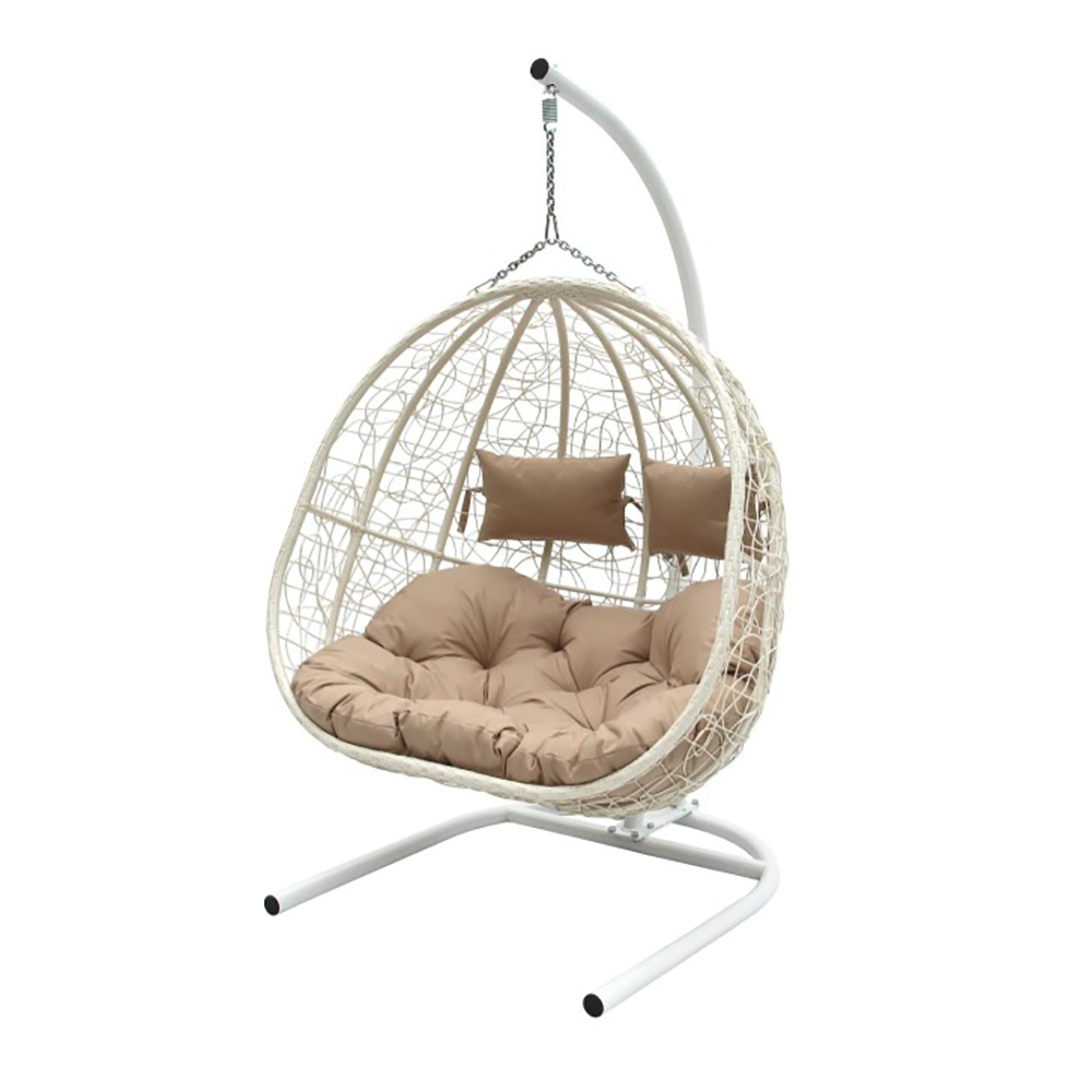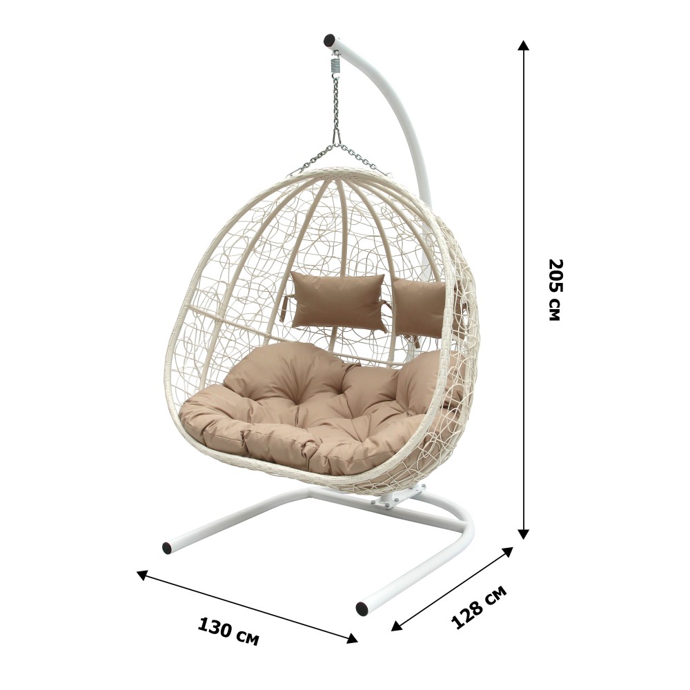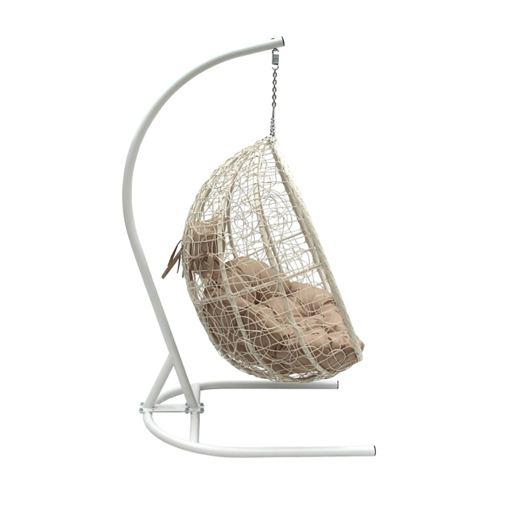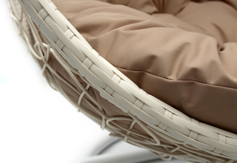 Подвесное кресло демонстрирует идеальное сочетание красоты и надежности. Оно изготовлено из прочной стальной трубы диаметром 50 мм, покрытой белой порошковой полимерной краской, что предотвращает коррозию и увеличивает долговечность изделия. Основа сиденья выполнена из современного искусственного ротанга, который имитирует натуральные волокна, обеспечивая естественный и эстетичный внешний вид. Водоотталкивающий чехол мягкого элемента бежевого цвета вместе с комфортным наполнителем из синтепона создают дополнительное удобство при посадке.