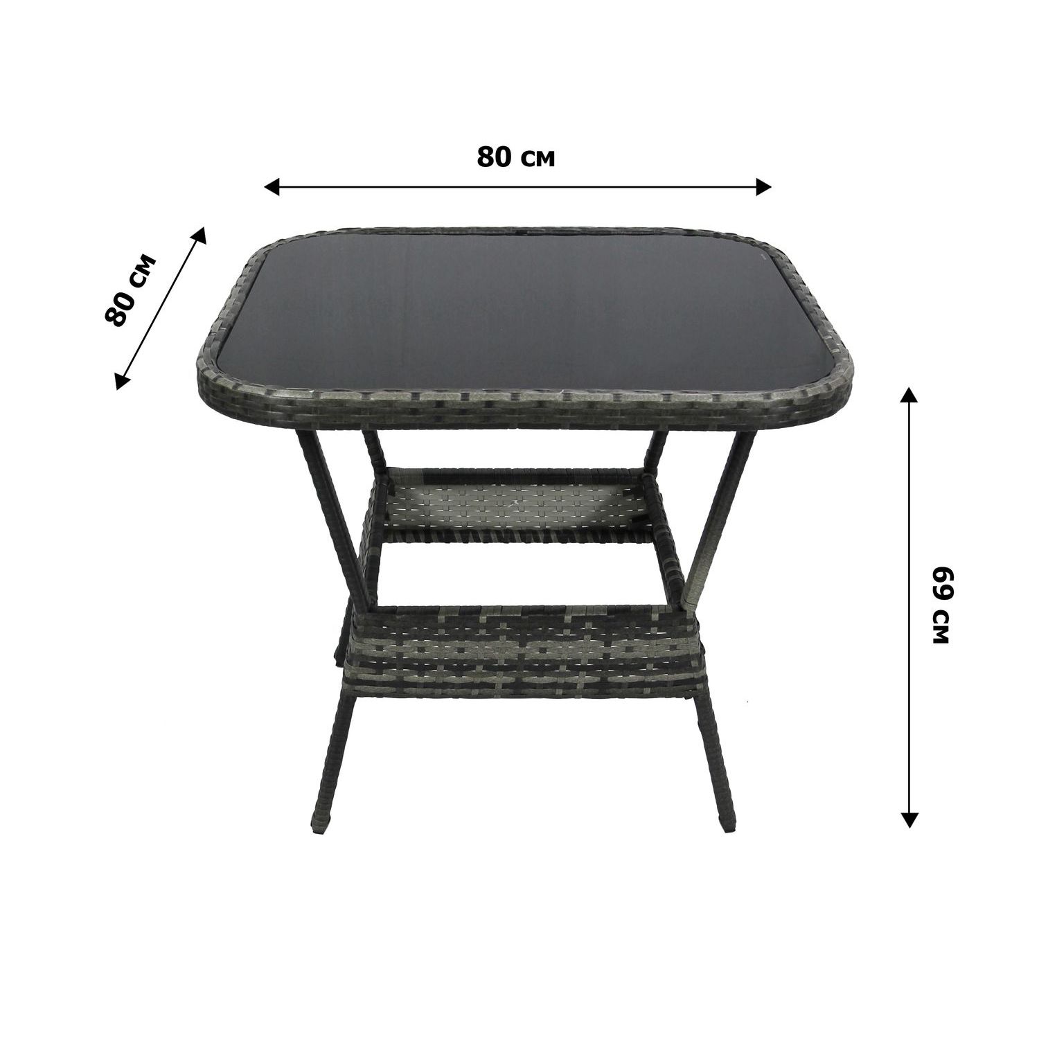 Каркас всей коллекции выполнен из прочной нержавеющей стали, обеспечивающей высокую устойчивость и надежность. Поверхность элементов декорирована искусственным ротангом серого цвета, придающим изделию современный и изысканный облик.