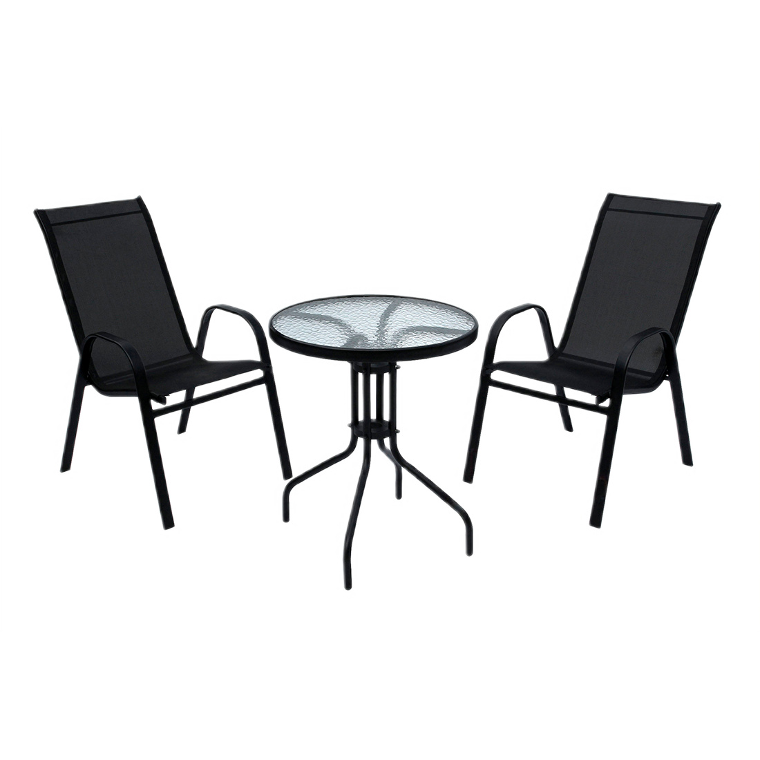 Поверхность стола выполнена из стекла, создавая лаконичный дизайн и лёгкий уход. Сиденья кресел покрыты однотонной тканью без рисунков, гармонирующей с общим стилем набора. Мебель отличается простотой сборки-разборки, позволяя легко транспортировать её и хранить вне сезона.