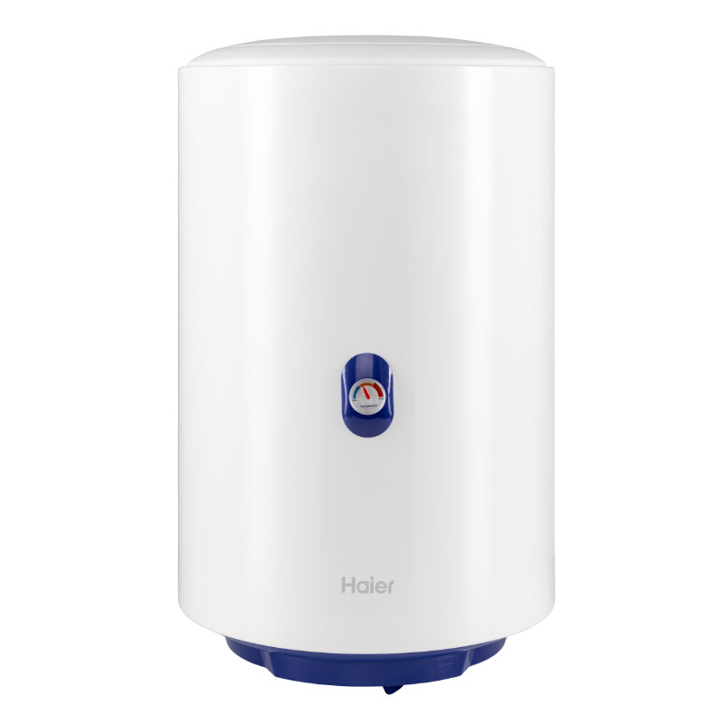 Электрический накопительный водонагреватель. Серия A4. Объем 50 литров. Вертикального исполнения. Цилиндрической формы. Для настенного монтажа. Внутренний бак из стали с эмалевым покрытием. Корпус металлический, цвет белый. Термометр на лицевой стороне. Механический регулятор температуры на нижней крышке. Патрубки холодной и горячей воды расположены снизу. Расстояние между патрубками 100 мм. Диаметр подключения 1/2" наружняя резьба. Фирменная технология Haier для защиты от поражения электрическим током - ShockProof - диэлектрические проставки на патрубках.