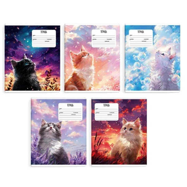 Тетрадь школьная ученическая, 24 л, клетка, арт. 68536/ 10 МЕЧТЫ КОТА /А5+, мягкий переплёт (2 скобы), УФ-лак, мелованный картон 190 г/м.
