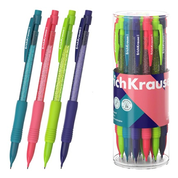 Механический карандаш круглой формы с удобной грип-зоной из резины. Корпус представлен в четырех цветах коллекции Reef с блестками. Оснащен ластиком. Твердость HB. Диаметр грифеля – 0.5 мм.