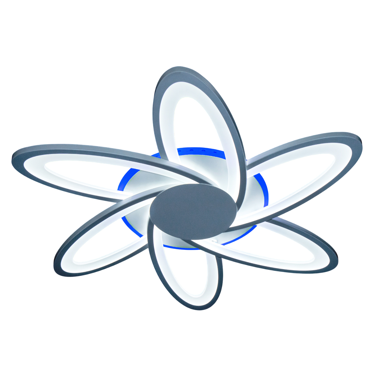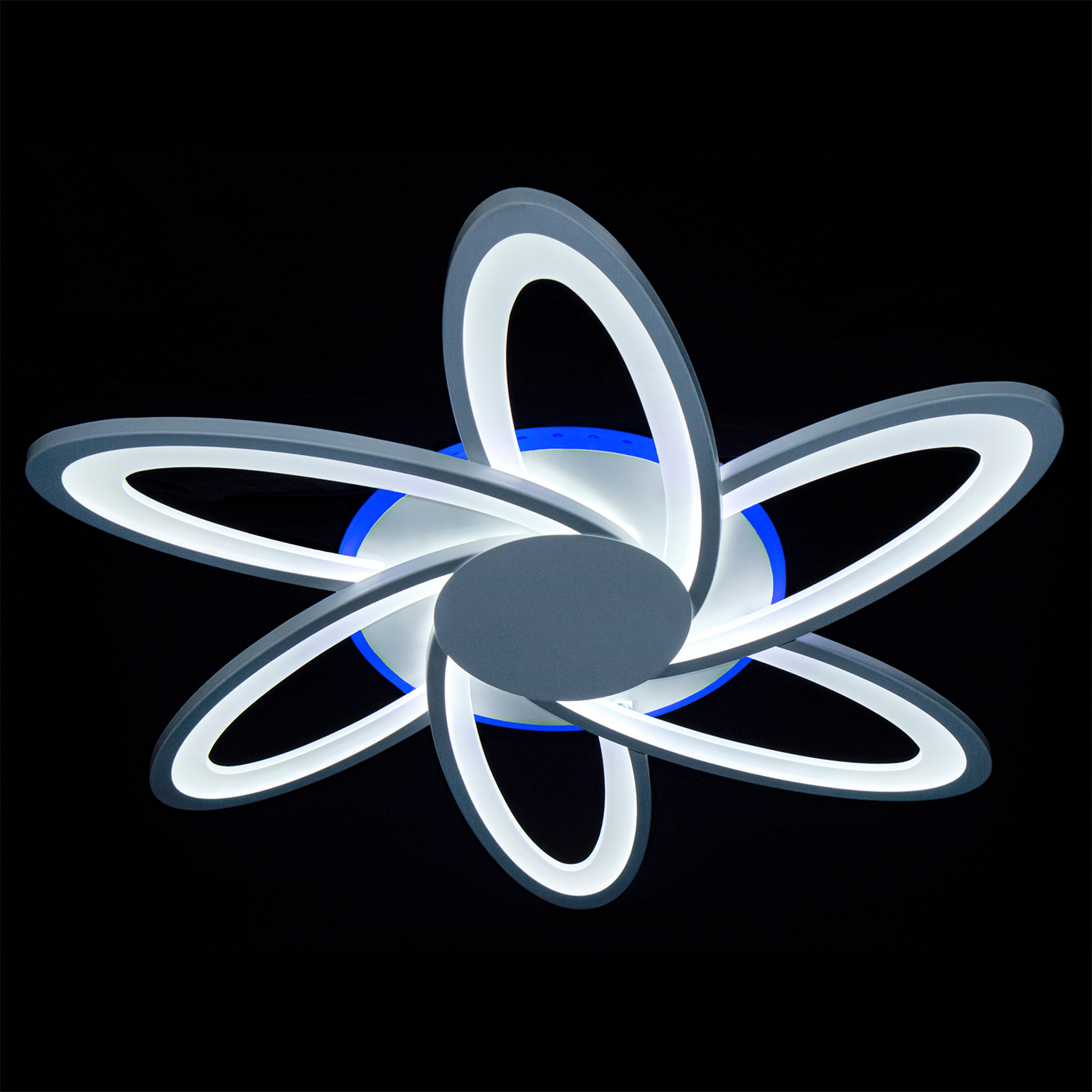 Конструкция светильника состоит из круглого потолочного основания с RGB-подсветкой. Шесть кронштейнов в виде овальных лепестков придают устройству легкость и элегантность.
