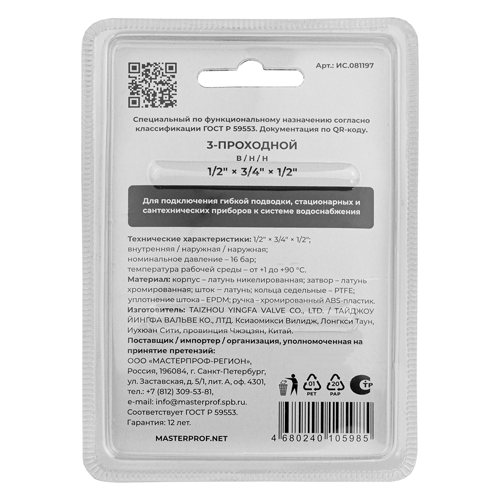 Кран шаровый MASTERPROF Трёхпроходной ВР-НР-НР 1/2"х3/4"х1/2" ИС.081197