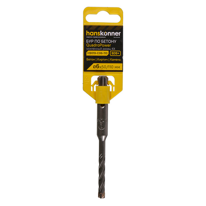 Бур HANSKONNER Quadro power 6х110мм H9019-C06-110 - оснастка для перфораторов, используется для ударного сверления отверстий в твёрдых материалах, таких как бетон, камень, кирпич.