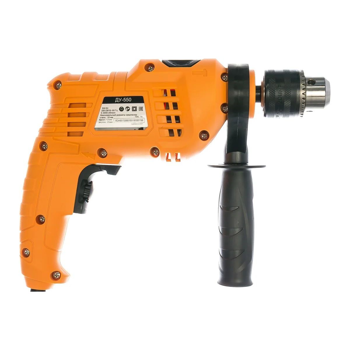 Модель электродрели Вихрь ДУ-550 оснащена реверсом, что обеспечивает вращение по и против часовой стрелке для закручивания и откручивания метизов, также помогает изъять застрявшее сверло без его повреждения. Диаметр патрона 1,5-13 мм позволяет выбирать сверла различного диаметра. Максимальный диаметр сверления стали - 10 мм, бетона - 13 мм, дерева - 25 мм.