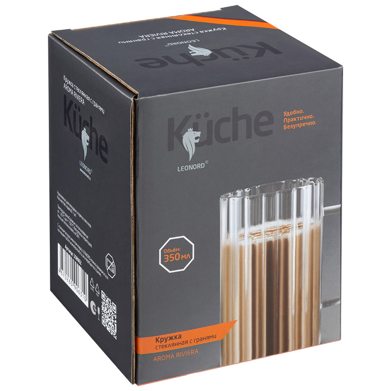 LEONORD Aroma Riviera — элегантная кружка из прочного боросиликатного стекла объемом 350 мл. Благодаря своему уникальному дизайну с граненой поверхностью, кружка привлекает внимание своей изысканной формой и прекрасно дополнит интерьер кухни или офиса. Эта кружка станет отличным выбором для ценителей стильных аксессуаров, придаст индивидуальность вашей коллекции посуды и позволит насладиться любимым напитком с особым удовольствием.