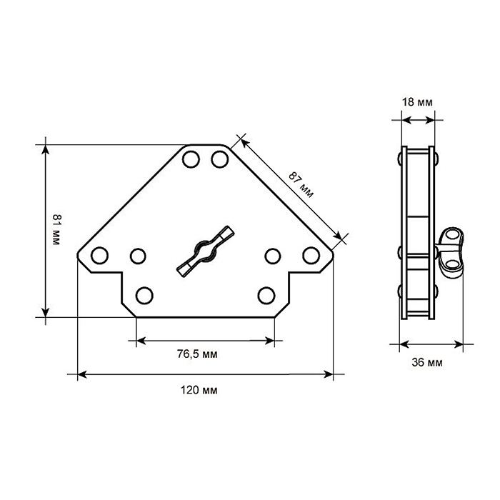 У этого магнитного уголка три угла позиционирования: 45°, 90°, 135°. Корпус уголка усиленный: изготовлен из двуслойной оцинкованной стали, основательно проклепан. Это упрочняет уголок, а заодно повышает его магнитную силу до 25 кг. Для сравнения: наш схожий по размерам сварочный угольник из однослойной стали удержит максимум 11 кг.