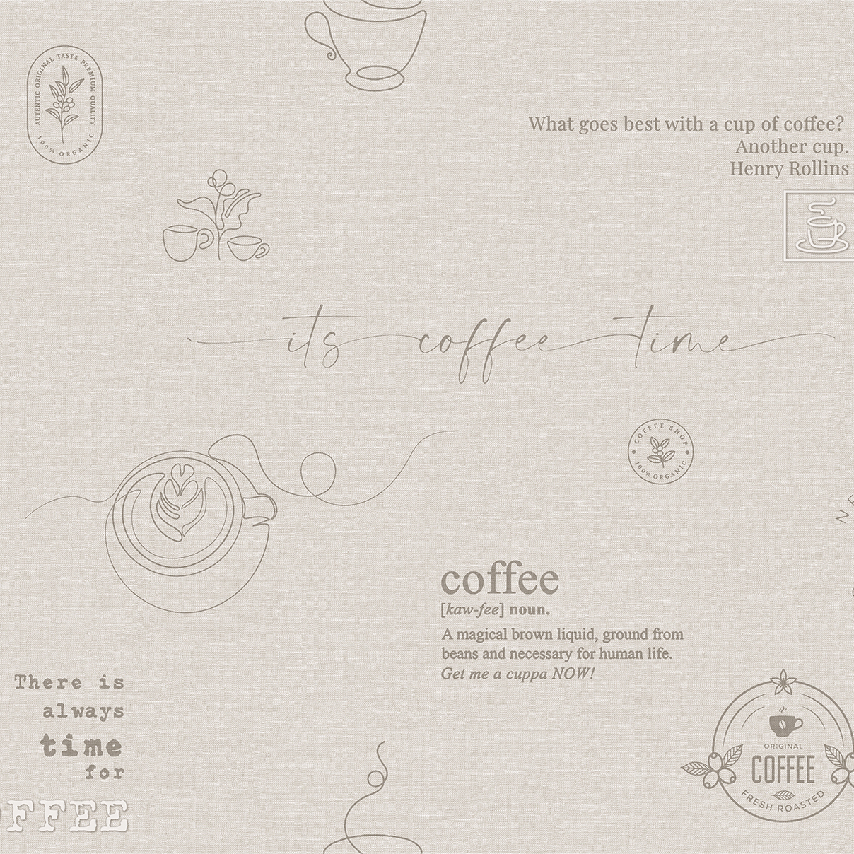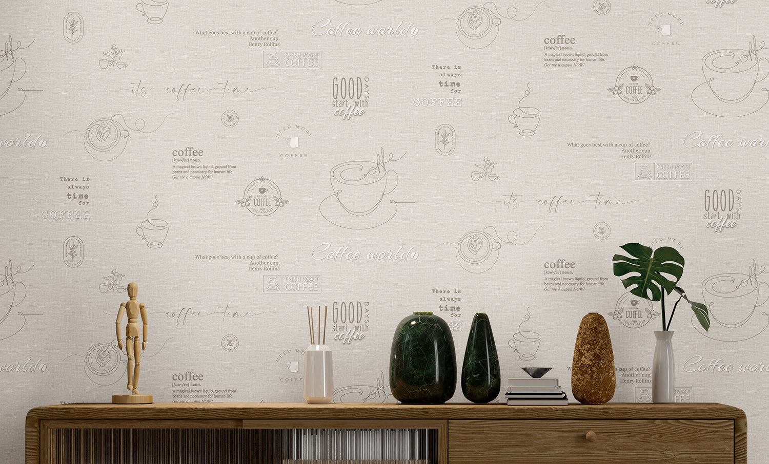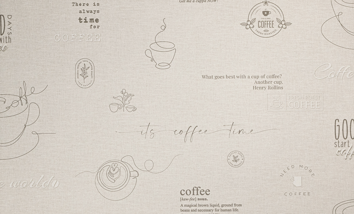 Коллекция обоев Café ТМ Ateliero — это стильное воплощение атмосферы утреннего ритуала, когда аромат свежесваренного кофе наполняет пространство теплом и вдохновением. На фоне мягкой текстильной фактуры размещены графичные линии чашек, кофейные листья и каллиграфические надписи, создающие ощущение уюта и непринуждённого общения. Обои выполнены в нейтральной природной палитре — оттенках серого, льняного и тёплого бежевого, что делает их универсальными для интерьеров сдержанного, сбалансированного дизайна. Элементы принта выглядят легко и ненавязчиво, словно наброски в блокноте бариста.